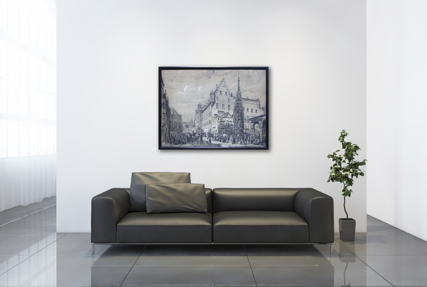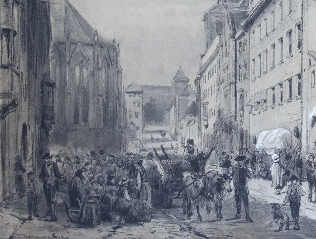 Cornelis Springer, The Beautiful Fountain with a view of Nuremberg Town Hall