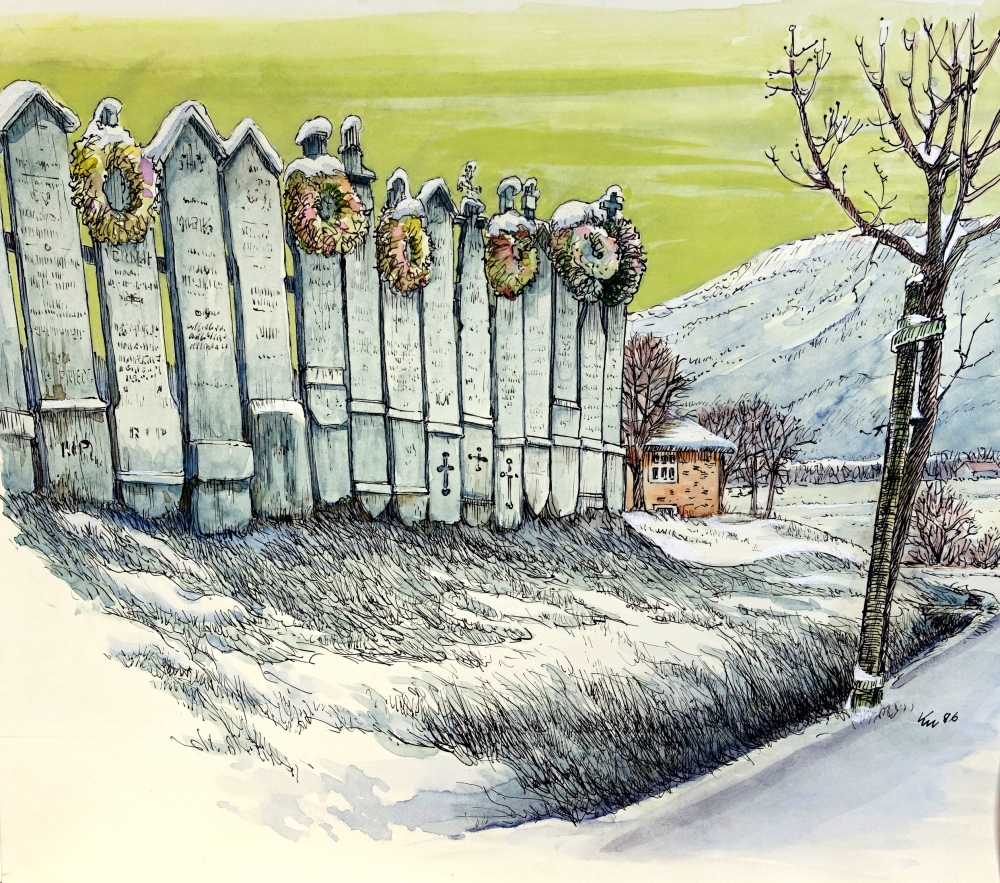 Heinrich Kuchenreuther, Tombs side by side string in a winter landscape