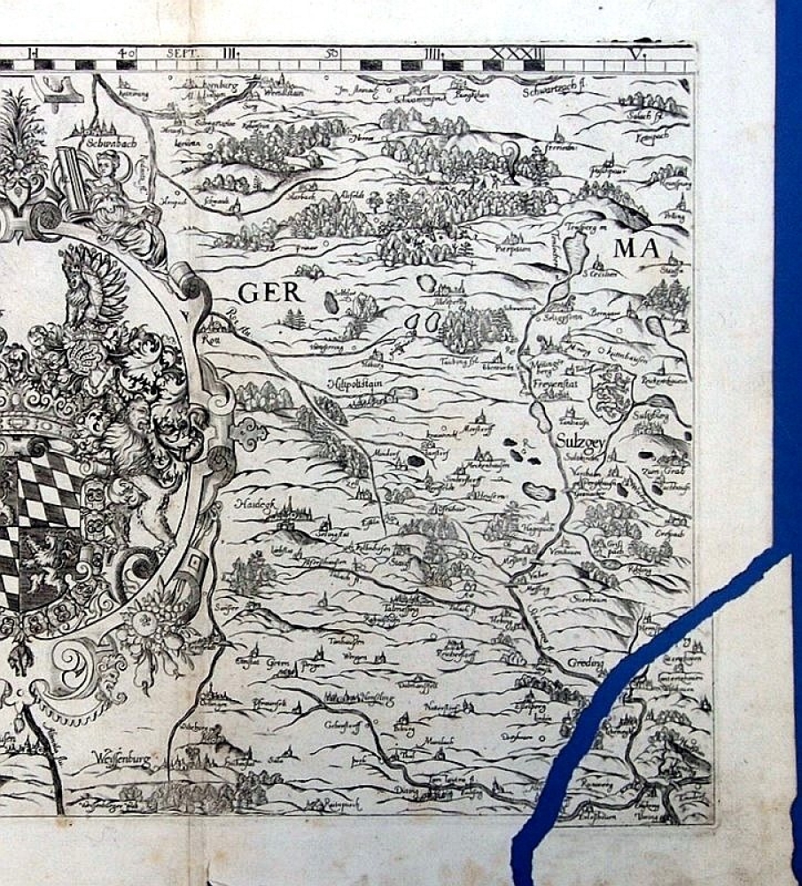 Mobile Preview: Cartographia Bavariae, Kupferstich-Karte um 1651, Gebiet um Hilpoltstein mit Schwabach, Wendelstein, Freystadt, Greding, Weissenburg und Gunzenhausen