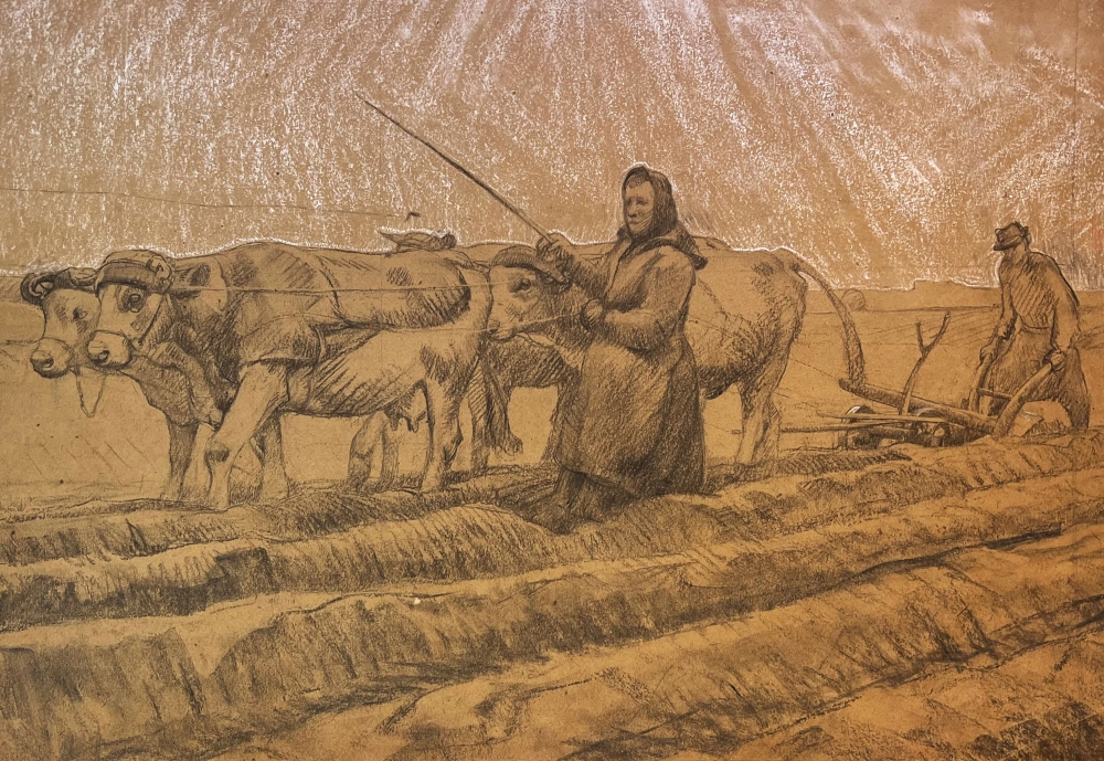 Andreas Bach, Pflügende Bauern mit Ochsen Fuhrwerk