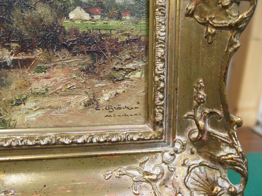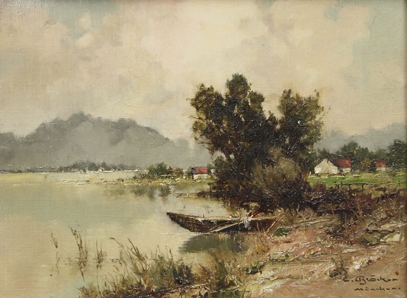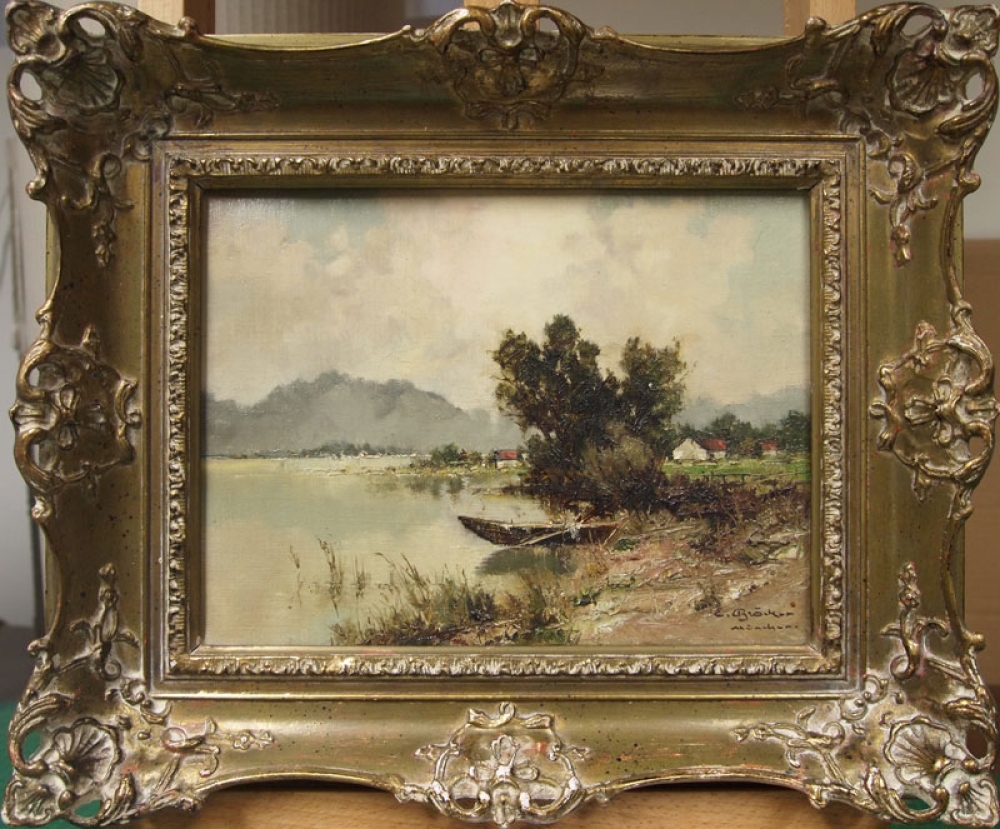 (1893 – 1963) Bayrischer See Ölgemälde, signiert „E.Bröcker“, Bildgröße 18cm x 23cm, Maße mit Rahmen 30cm x 35cm.