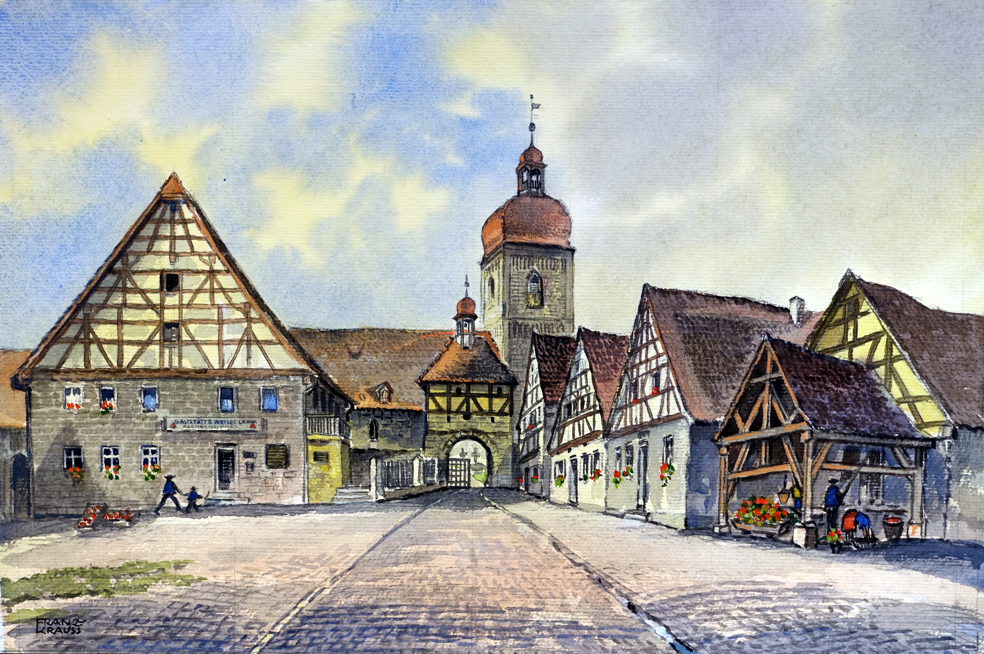 Franz Andreas Krauss (1909 - Fürth - 1983) Landschaftsmaler, Graphiker. Besuch der Staatsschule für angewandte Kunst Nürnberg unter Rudolf Schiestl und Max Körner. Krauss lebte als Maler und Graphiker in Nürnberg und malte in Öl und Aquarell vorwiegend Motive aus Nürnberg und der Fränkischen Landschaft. Mitarbeiter des Dt. Hausbuch-Verlages. Dürer-Preisträger. Seine Werke befinden sich in den Museen der Stadt Nürnberg, Privatsammlung Grieb. Lit.: Vollmer, Nürnberger Künstlerlexikon hrsg. v. M. Grieb.