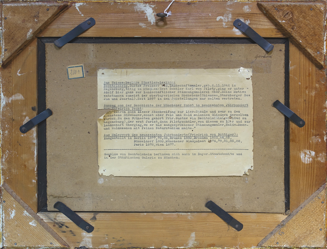 Bechtolsheim, Gustav Freiherr von, Landschaftsmaler, geb.2.11.1842 in Regensburg, tätig in München: Erst Schüler Karl von Piloty, ging er unter Adolf Lier ganz zur landschaftlicher Stimmungsmalerei über. Seine Motive entstammen zumeist der oberbayerischen Hochebene (Chiemsee, Starnberger See Jnn und Jaartal). Seit 1897 in den Ausstellungen nur selten vertreten.