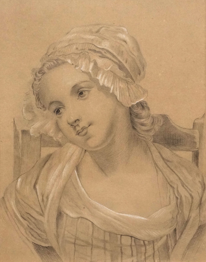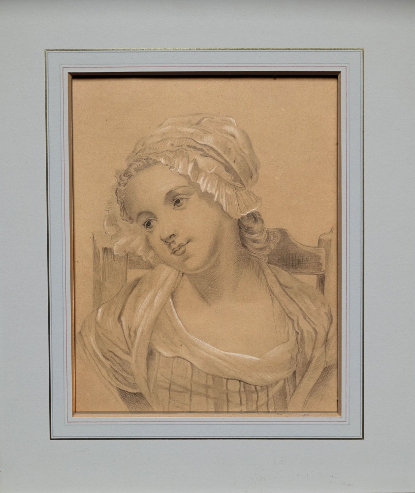 Mädchenportrait, auf Stuhl sitzend Zeichnung, rücks. m. Künstleretikett u. dat. 1869, Maße 34 x 29 cm, Maße mit Passepartout 36,5 x 31 cm