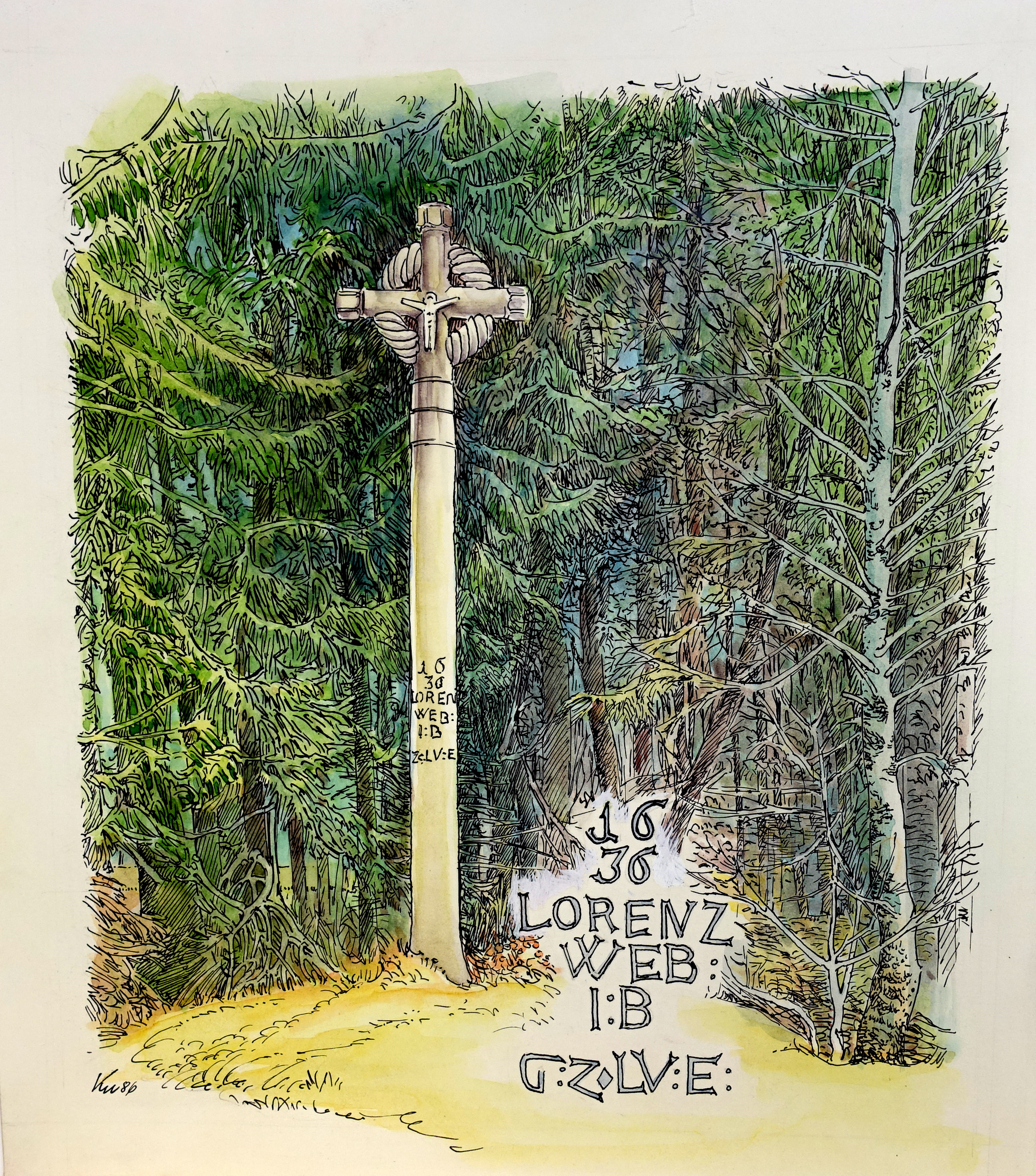 Heinrich Kuchenreuther, Kreuzpfeiler mit Aufschrift im Wald