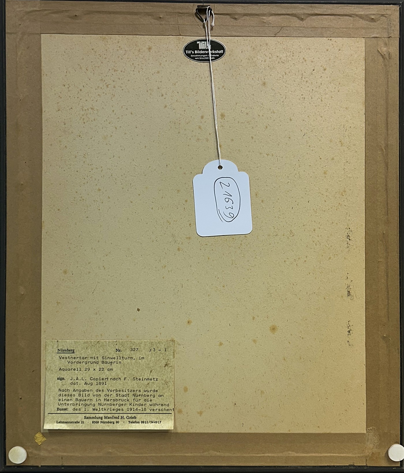 Nürnberg, Festner Tor mit Sinwellturm Aquarell Maße: 29 × 22 cm Maße mit Rahmen: 36 X 44,5 cm Unten rechts signiert August 1891