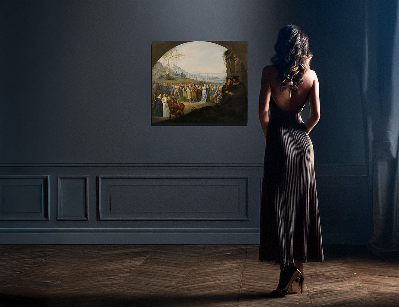 Foto Hinweis: Der Hintergrund des Fotos, in dem das Gemälde an der Wand präsentiert wird, ist teilweise mithilfe von KI gestaltet.
