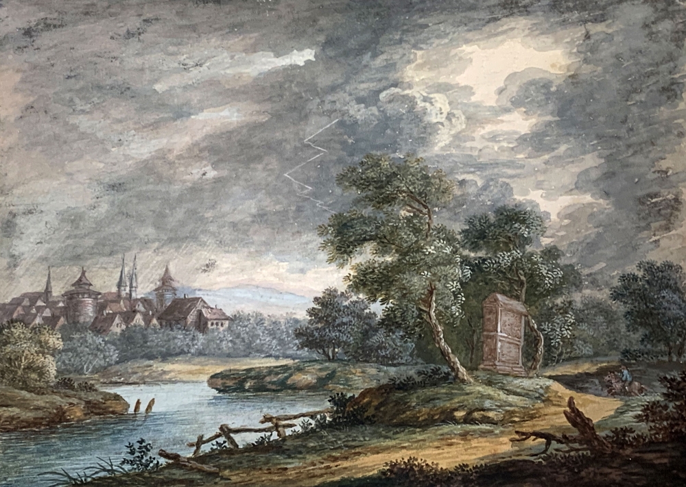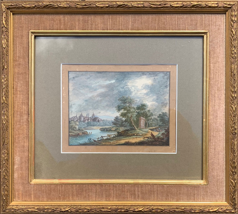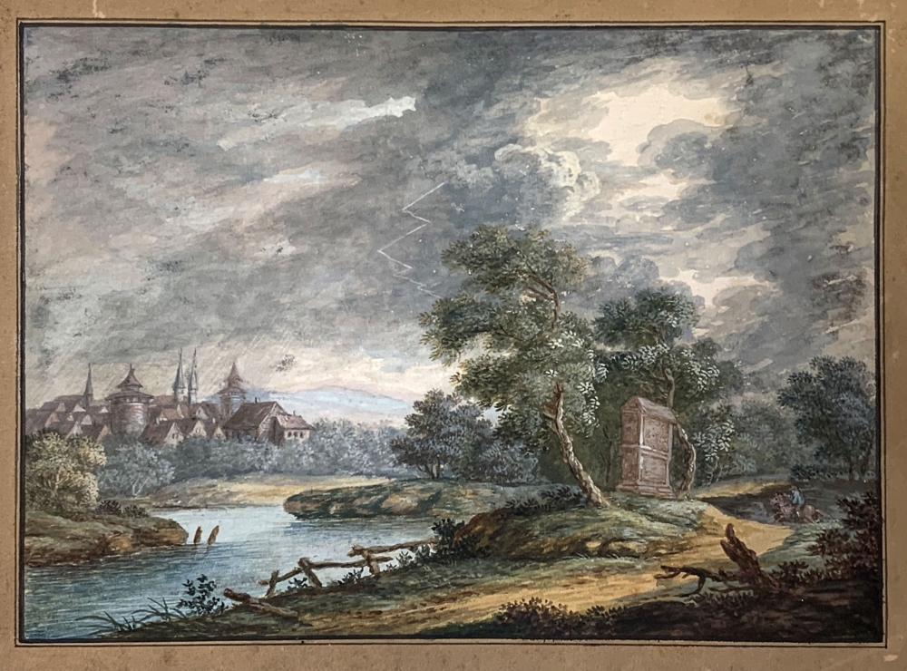 Sommerliche Landschaft mit Blick über einen Fluß auf eine Stadt, eventuell der Blick über die Pegnitz auf Nürnberg um 1770