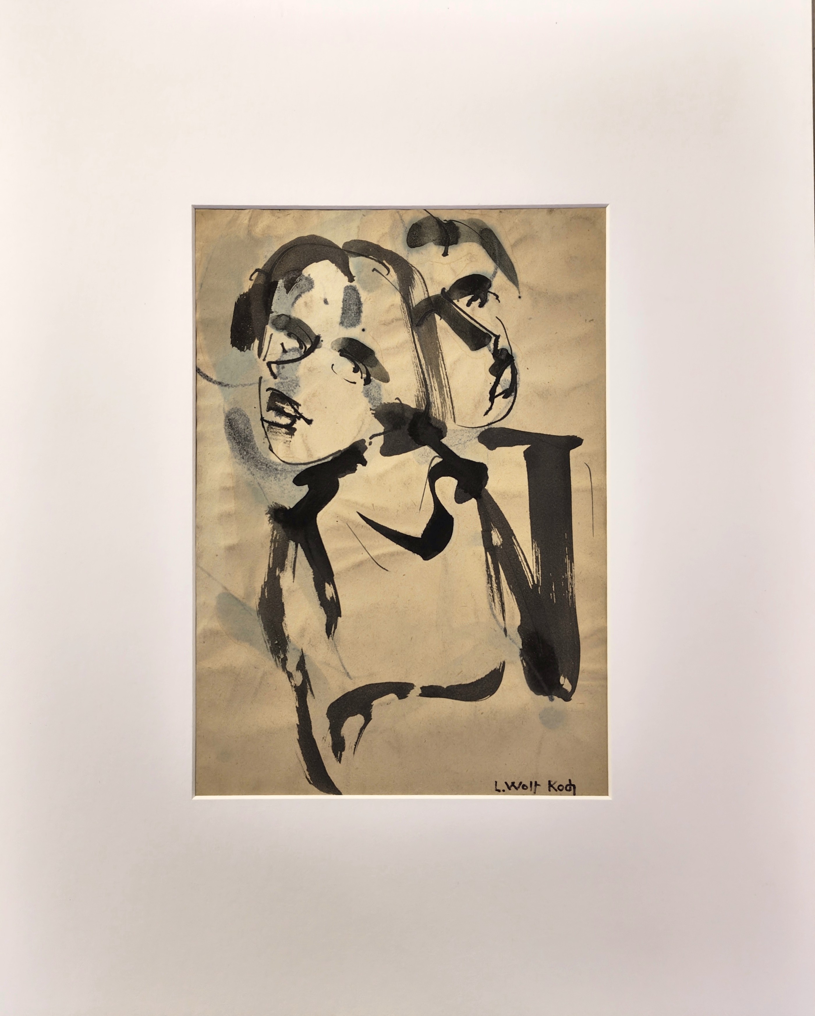 Lotte Wolf wurde 1909 in Kempten geboren. Sie studierte 1933/34, also während der Machtübernahme der Nationalsozialisten, an der Staatsschule für angewandte Kunst bei den Professoren: Emma Hoffmann, Max Körner, Karl Dotzler in Nürnberg. Gemäß der expressionistischen Ausrichtung ihrer Kunst hatte sie zu Beginn ihrer Laufbahn keine Chance, Fuß zu fassen und begann ihre Arbeiten erst nach dem Zweiten Weltkrieg auszustellen. Ihr frühes Werk, bestehend aus Portraits, Landschaften und Stillleben, fällt demnach in die Zeit der Künstler der "Verlorenen Generation", die sich nach dem Zweiten Weltkrieg oftmals der Abstraktion zuwandten, so auch Lotte Wolf. Nach ihrer Heirat, wohl ab 1975, nannte sie sich Lotte Wolf-Koch. Die teils harten Konturen der schwarzen Partien in der vorliegenden Arbeit und das sanfte Sich-Aufstülpen der Farbe entlang mancher Konturenränder lassen vermuten, dass Wolf die Arbeit in der Art einer Monotypie gestaltete, womit sie stilistisch eng an Künstler wie Otto Lange heranrückt. Ihr Oeuvre umfasst Werke in Öl, Aquarell, Pastell, Druckgrafiken entstanden meist als Linolschnitte. Stellt seit 1949 aus u.a.: 1953 im Nürnberger Albrecht Dürer Verein sowie Sonderschau 1958 im Märk. Mus. in Witten, Rhur (ill. Kat.). Malte gegenständlich (Expressionistin) und abstrakt. Figürliches, Bildnisse, Landschaften, Stillleben.