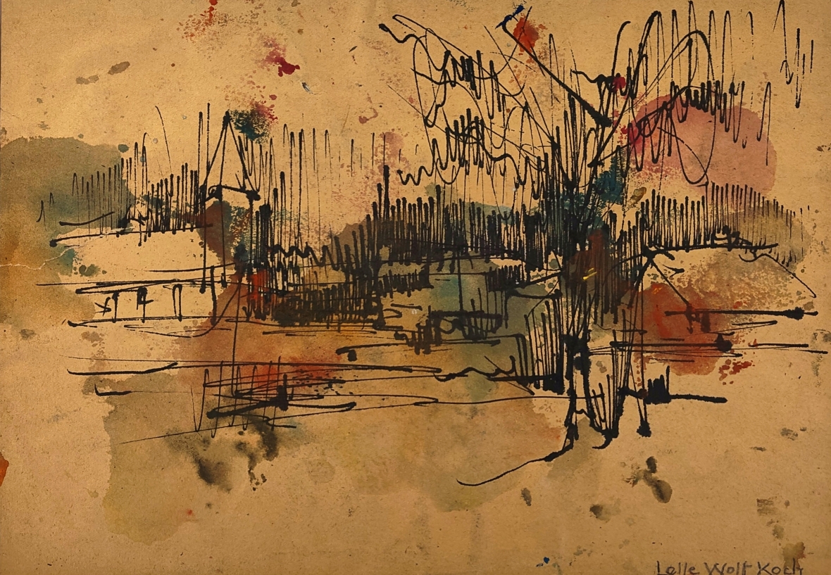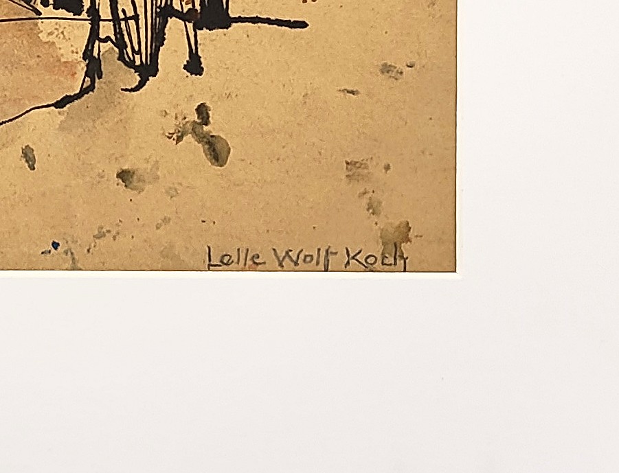Lotte Wolf wurde 1909 in Kempten geboren. Sie studierte 1933/34, also während der Machtübernahme der Nationalsozialisten, an der Staatsschule für angewandte Kunst bei den Professoren: Emma Hoffmann, Max Körner, Karl Dotzler in Nürnberg. Gemäß der expressionistischen Ausrichtung ihrer Kunst hatte sie zu Beginn ihrer Laufbahn keine Chance, Fuß zu fassen und begann ihre Arbeiten erst nach dem Zweiten Weltkrieg auszustellen. Ihr frühes Werk, bestehend aus Portraits, Landschaften und Stillleben, fällt demnach in die Zeit der Künstler der "Verlorenen Generation", die sich nach dem Zweiten Weltkrieg oftmals der Abstraktion zuwandten, so auch Lotte Wolf. Nach ihrer Heirat, wohl ab 1975, nannte sie sich Lotte Wolf-Koch. Die teils harten Konturen der schwarzen Partien in der vorliegenden Arbeit und das sanfte Sich-Aufstülpen der Farbe entlang mancher Konturenränder lassen vermuten, dass Wolf die Arbeit in der Art einer Monotypie gestaltete, womit sie stilistisch eng an Künstler wie Otto Lange heranrückt. Ihr Oeuvre umfasst Werke in Öl, Aquarell, Pastell, Druckgrafiken entstanden meist als Linolschnitte. Stellt seit 1949 aus u.a.: 1953 im Nürnberger Albrecht Dürer Verein sowie Sonderschau 1958 im Märk. Mus. in Witten, Rhur (ill. Kat.). Malte gegenständlich (Expressionistin) und abstrakt. Figürliches, Bildnisse, Landschaften, Stillleben.