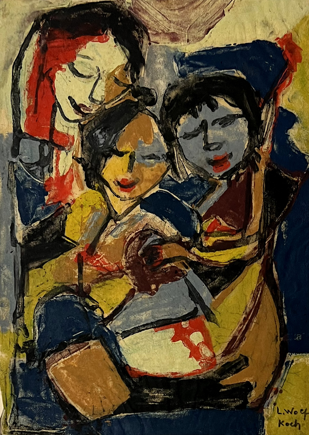 Lotte Wolf wurde 1909 in Kempten geboren. Sie studierte 1933/34, also während der Machtübernahme der Nationalsozialisten, an der Staatsschule für angewandte Kunst bei den Professoren: Emma Hoffmann, Max Körner, Karl Dotzler in Nürnberg. Gemäß der expressionistischen Ausrichtung ihrer Kunst hatte sie zu Beginn ihrer Laufbahn keine Chance, Fuß zu fassen, und begann ihre Arbeiten erst nach dem Zweiten Weltkrieg auszustellen. Ihr frühes Werk, bestehend aus Portraits, Landschaften und Stillleben, fällt demnach in die Zeit der Künstler der "Verlorenen Generation", die sich nach dem Zweiten Weltkrieg oftmals der Abstraktion zuwandten, so auch Lotte Wolf. Nach ihrer Heirat, wohl ab 1975, nannte sie sich Lotte Wolf-Koch. Die teils harten Konturen der schwarzen Partien in der vorliegenden Arbeit und das sanfte Sich-Aufstülpen der Farbe entlang mancher Konturenränder lassen vermuten, dass Wolf die Arbeit in der Art einer Monotypie gestaltete, womit sie stilistisch eng an Künstler wie Otto Lange heranrückt.
