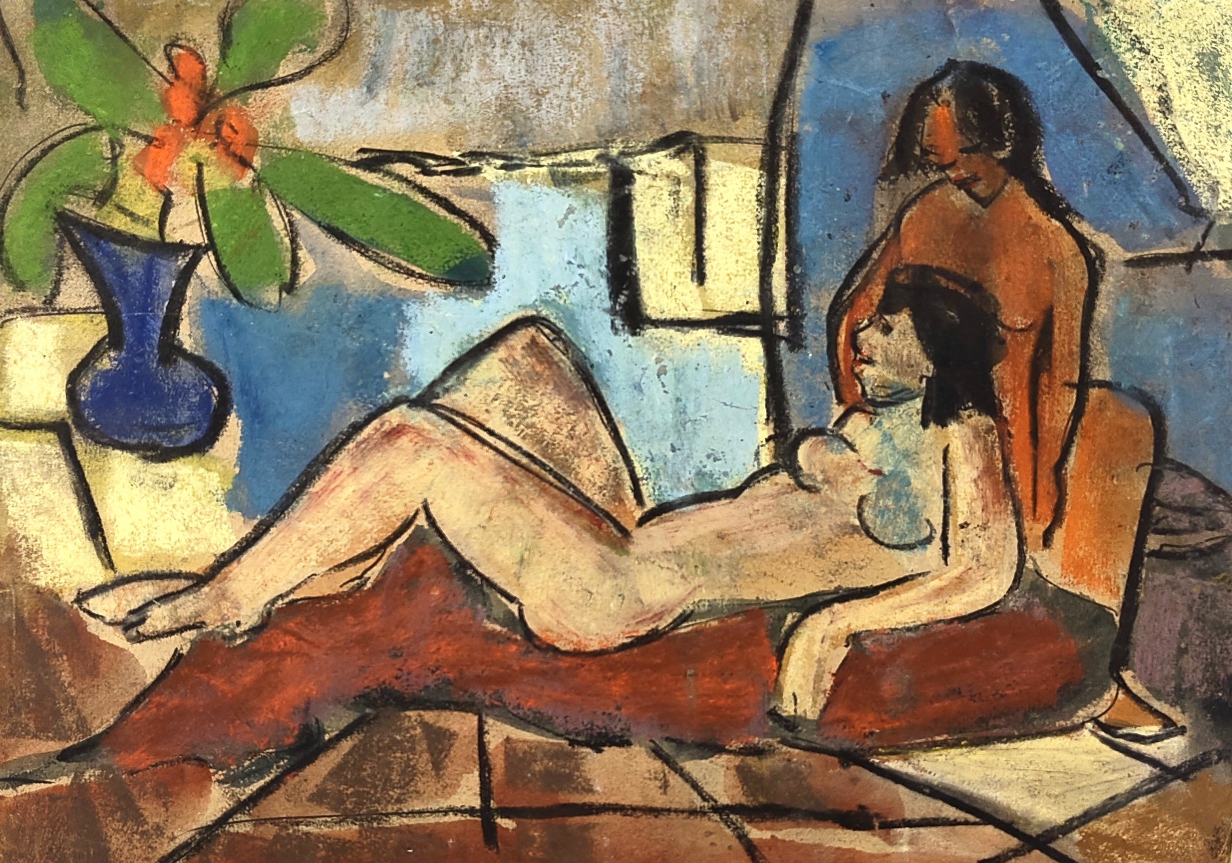 Lotte Wolf wurde 1909 in Kempten geboren. Sie studierte 1933/34, also während der Machtübernahme der Nationalsozialisten, an der Staatsschule für angewandte Kunst bei den Professoren: Emma Hoffmann, Max Körner, Karl Dotzler in Nürnberg. Gemäß der expressionistischen Ausrichtung ihrer Kunst hatte sie zu Beginn ihrer Laufbahn keine Chance, Fuß zu fassen und begann ihre Arbeiten erst nach dem Zweiten Weltkrieg auszustellen. Ihr frühes Werk, bestehend aus Portraits, Landschaften und Stillleben, fällt demnach in die Zeit der Künstler der "Verlorenen Generation", die sich nach dem Zweiten Weltkrieg oftmals der Abstraktion zuwandten, so auch Lotte Wolf. Nach ihrer Heirat, wohl ab 1975, nannte sie sich Lotte Wolf-Koch. Die teils harten Konturen der schwarzen Partien in der vorliegenden Arbeit und das sanfte Sich-Aufstülpen der Farbe entlang mancher Konturenränder lassen vermuten, dass Wolf die Arbeit in der Art einer Monotypie gestaltete, womit sie stilistisch eng an Künstler wie Otto Lange heranrückt. Ihr Oeuvre umfasst Werke in Öl, Aquarell, Pastell, Druckgrafiken entstanden meist als Linolschnitte. Stellt seit 1949 aus u.a.: 1953 im Nürnberger Albrecht Dürer Verein sowie Sonderschau 1958 im Märk. Mus. in Witten, Rhur (ill. Kat.). Malte gegenständlich (Expressionistin) und abstrakt. Figürliches, Bildnisse, Landschaften, Stillleben.