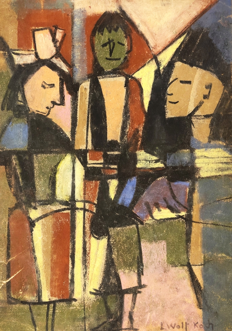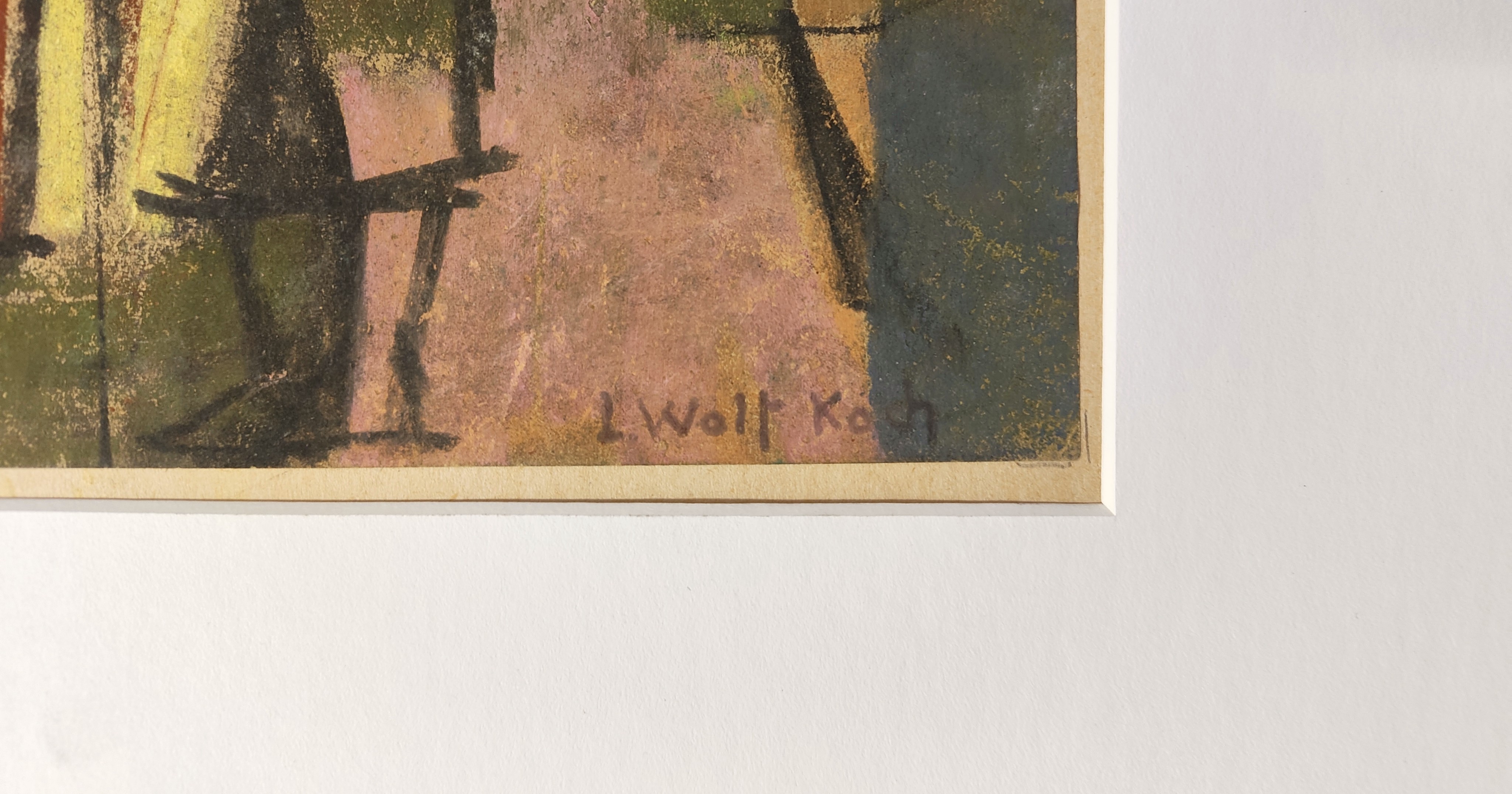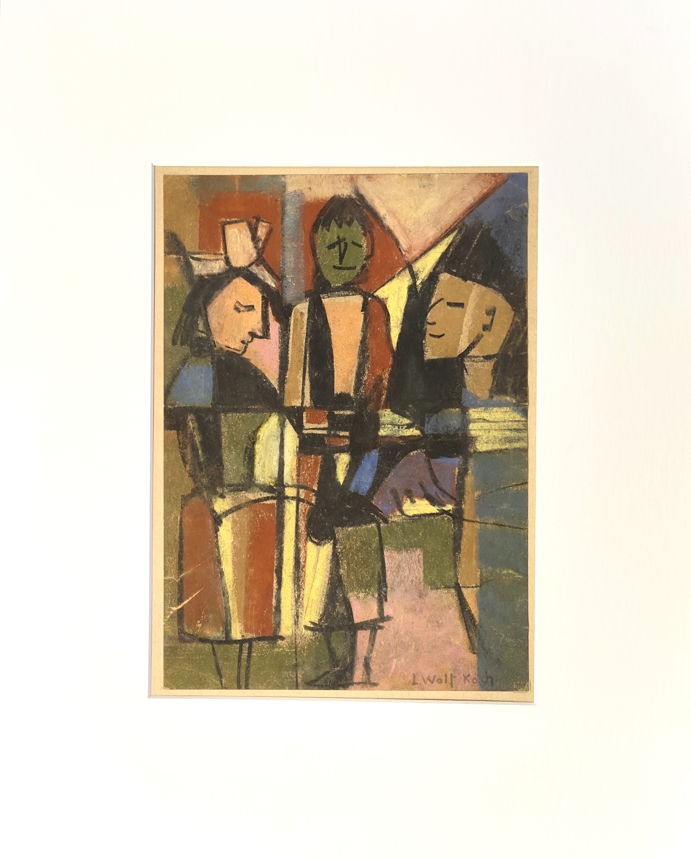 Lotte Wolf wurde 1909 in Kempten geboren. Sie studierte 1933/34, also während der Machtübernahme der Nationalsozialisten, an der Staatsschule für angewandte Kunst bei den Professoren: Emma Hoffmann, Max Körner, Karl Dotzler in Nürnberg. Gemäß der expressionistischen Ausrichtung ihrer Kunst hatte sie zu Beginn ihrer Laufbahn keine Chance, Fuß zu fassen und begann ihre Arbeiten erst nach dem Zweiten Weltkrieg auszustellen. Ihr frühes Werk, bestehend aus Portraits, Landschaften und Stillleben, fällt demnach in die Zeit der Künstler der "Verlorenen Generation", die sich nach dem Zweiten Weltkrieg oftmals der Abstraktion zuwandten, so auch Lotte Wolf. Nach ihrer Heirat, wohl ab 1975, nannte sie sich Lotte Wolf-Koch. Die teils harten Konturen der schwarzen Partien in der vorliegenden Arbeit und das sanfte Sich-Aufstülpen der Farbe entlang mancher Konturenränder lassen vermuten, dass Wolf die Arbeit in der Art einer Monotypie gestaltete, womit sie stilistisch eng an Künstler wie Otto Lange heranrückt. Ihr Oeuvre umfasst Werke in Öl, Aquarell, Pastell, Druckgrafiken entstanden meist als Linolschnitte. Stellt seit 1949 aus u.a.: 1953 im Nürnberger Albrecht Dürer Verein sowie Sonderschau 1958 im Märk. Mus. in Witten, Rhur (ill. Kat.). Malte gegenständlich (Expressionistin) und abstrakt. Figürliches, Bildnisse, Landschaften, Stillleben.
