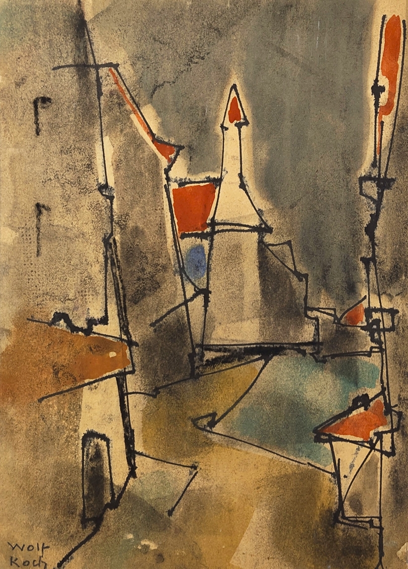 Lotte Wolf wurde 1909 in Kempten geboren. Sie studierte 1933/34, also während der Machtübernahme der Nationalsozialisten, an der Staatsschule für angewandte Kunst bei den Professoren: Emma Hoffmann, Max Körner, Karl Dotzler in Nürnberg. Gemäß der expressionistischen Ausrichtung ihrer Kunst hatte sie zu Beginn ihrer Laufbahn keine Chance, Fuß zu fassen und begann ihre Arbeiten erst nach dem Zweiten Weltkrieg auszustellen. Ihr frühes Werk, bestehend aus Portraits, Landschaften und Stillleben, fällt demnach in die Zeit der Künstler der "Verlorenen Generation", die sich nach dem Zweiten Weltkrieg oftmals der Abstraktion zuwandten, so auch Lotte Wolf. Nach ihrer Heirat, wohl ab 1975, nannte sie sich Lotte Wolf-Koch. Die teils harten Konturen der schwarzen Partien in der vorliegenden Arbeit und das sanfte Sich-Aufstülpen der Farbe entlang mancher Konturenränder lassen vermuten, dass Wolf die Arbeit in der Art einer Monotypie gestaltete, womit sie stilistisch eng an Künstler wie Otto Lange heranrückt. Ihr Oeuvre umfasst Werke in Öl, Aquarell, Pastell, Druckgrafiken entstanden meist als Linolschnitte. Stellt seit 1949 aus u.a.: 1953 im Nürnberger Albrecht Dürer Verein sowie Sonderschau 1958 im Märk. Mus. in Witten, Rhur (ill. Kat.). Malte gegenständlich (Expressionistin) und abstrakt. Figürliches, Bildnisse, Landschaften, Stillleben.