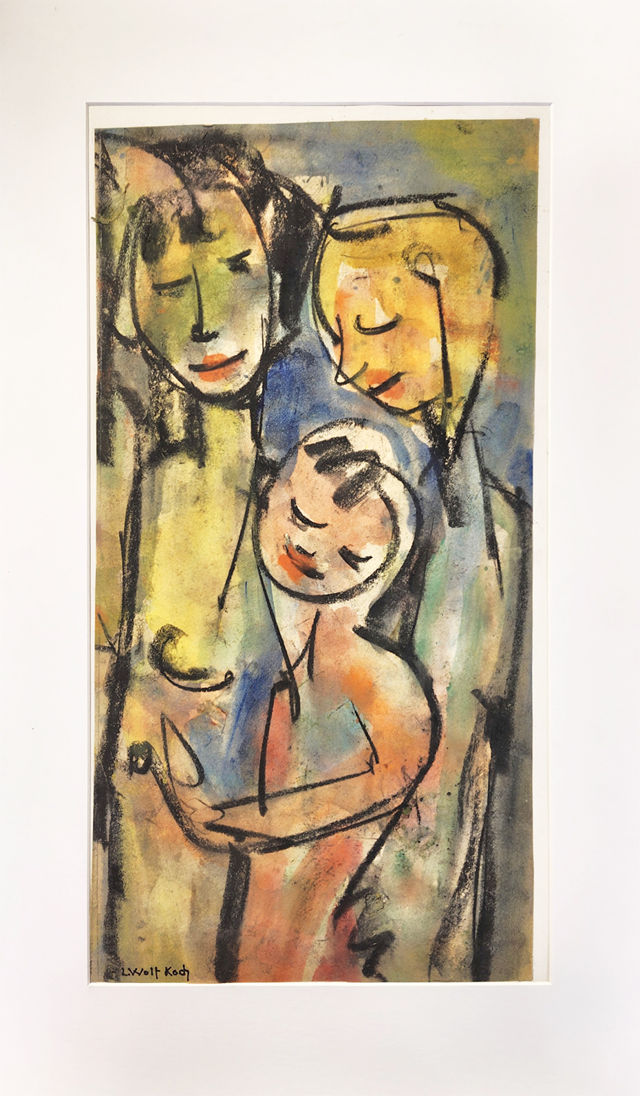 Lotte Wolf wurde 1909 in Kempten geboren. Sie studierte 1933/34, also während der Machtübernahme der Nationalsozialisten, an der Staatsschule für angewandte Kunst bei den Professoren: Emma Hoffmann, Max Körner, Karl Dotzler in Nürnberg. Gemäß der expressionistischen Ausrichtung ihrer Kunst hatte sie zu Beginn ihrer Laufbahn keine Chance, Fuß zu fassen und begann ihre Arbeiten erst nach dem Zweiten Weltkrieg auszustellen. Ihr frühes Werk, bestehend aus Portraits, Landschaften und Stillleben, fällt demnach in die Zeit der Künstler der "Verlorenen Generation", die sich nach dem Zweiten Weltkrieg oftmals der Abstraktion zuwandten, so auch Lotte Wolf. Nach ihrer Heirat, wohl ab 1975, nannte sie sich Lotte Wolf-Koch. Die teils harten Konturen der schwarzen Partien in der vorliegenden Arbeit und das sanfte Sich-Aufstülpen der Farbe entlang mancher Konturenränder lassen vermuten, dass Wolf die Arbeit in der Art einer Monotypie gestaltete, womit sie stilistisch eng an Künstler wie Otto Lange heranrückt. Ihr Oeuvre umfasst Werke in Öl, Aquarell, Pastell, Druckgrafiken entstanden meist als Linolschnitte. Stellt seit 1949 aus u.a.: 1953 im Nürnberger Albrecht Dürer Verein sowie Sonderschau 1958 im Märk. Mus. in Witten, Rhur (ill. Kat.). Malte gegenständlich (Expressionistin) und abstrakt. Figürliches, Bildnisse, Landschaften, Stillleben.