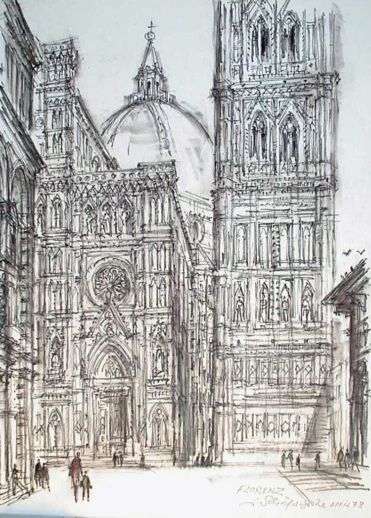 Ludwig Schäfer-Grohe (1909 Mainz-1983 Fellbach), deutscher Maler, Zeichner und Lithograph. Lithographen-Lehre, 1931 erste Sonderausstellung im Gutenberg-Museum Mainz. 1932 Studienfahrt nach Italien. 1934 Heirat mit der Malerin und Bildhauerin Susanne Grohe. 1936 Umzug nach Fellbach; Mitarbeit beim Stuttgarter Verlag und als freischaffender Künstler tätig. In eigener Planung: Städtebilder, künstleriche Bild-Landkarten, Malerfahrt - Bücher: u. a. Neckar/ Rhein/Tauber. Arbeiten in vielen Städten und Ländern. Nach Deutschland und Europa folgen Studienfahrten in ferne Gebiete: u.a. 1976 Marokko, 1977 Mesopotanien, 1978 Mexiko und Guatemala, 1979 Nepal-Indien-Sri Lanka, 1980 Ägypten. Besondere Aufträge wie z. B. 1979: Zeichnen in der Medici-Kapelle in Florenz für Fredy de Medicis, Brüssel. Ankäufe seiner Bilder u.a. von der Stadt Fellbach, dem Rems-Murr-Kreis, der Staatsgalerie Stuttgart. Literatur: Vollmer, Thieme Becker, Würtenbergisches Künstlerlexikon zahlreiche Zeitungsberichte/ Ausstellungsnachweise vorhanden.