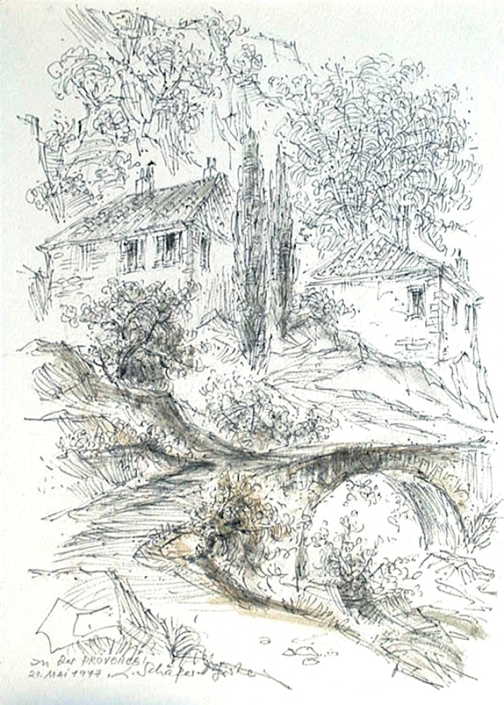 Ludwig Schäfer-Grohe (1909 Mainz-1983 Fellbach), deutscher Maler, Zeichner und Lithograph. Lithographen-Lehre, 1931 erste Sonderausstellung im Gutenberg-Museum Mainz. 1932 Studienfahrt nach Italien. 1934 Heirat mit der Malerin und Bildhauerin Susanne Grohe. 1936 Umzug nach Fellbach; Mitarbeit beim Stuttgarter Verlag und als freischaffender Künstler tätig. In eigener Planung: Städtebilder, künstleriche Bild-Landkarten, Malerfahrt - Bücher: u. a. Neckar/ Rhein/Tauber. Arbeiten in vielen Städten und Ländern. Nach Deutschland und Europa folgen Studienfahrten in ferne Gebiete: u.a. 1976 Marokko, 1977 Mesopotanien, 1978 Mexiko und Guatemala, 1979 Nepal-Indien-Sri Lanka, 1980 Ägypten. Besondere Aufträge wie z. B. 1979: Zeichnen in der Medici-Kapelle in Florenz für Fredy de Medicis, Brüssel. Ankäufe seiner Bilder u.a. von der Stadt Fellbach, dem Rems-Murr-Kreis, der Staatsgalerie Stuttgart. Literatur: Vollmer, Thieme Becker, Würtenbergisches Künstlerlexikon zahlreiche Zeitungsberichte/ Ausstellungsnachweise vorhanden.