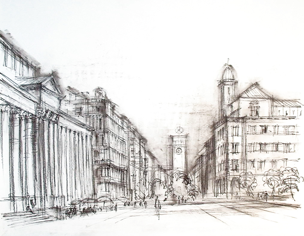 Ludwig Schäfer-Grohe, Königstraße mit Königsbau Passagen und Blick auf den Hauptbahnhof Stuttgart