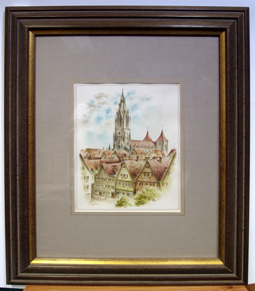Ludwig Schäfer-Grohe (1909 Mainz-1983 Fellbach), deutscher Maler, Zeichner und Lithograph. Lithographen-Lehre, 1931 erste Sonderausstellung im Gutenberg-Museum Mainz. 1932 Studienfahrt nach Italien. 1934 Heirat mit der Malerin und Bildhauerin Susanne Grohe. 1936 Umzug nach Fellbach; Mitarbeit beim Stuttgarter Verlag und als freischaffender Künstler tätig. In eigener Planung: Städtebilder, künstleriche Bild-Landkarten, Malerfahrt - Bücher: u. a. Neckar/ Rhein/Tauber. Arbeiten in vielen Städten und Ländern. Nach Deutschland und Europa folgen Studienfahrten in ferne Gebiete: u.a. 1976 Marokko, 1977 Mesopotanien, 1978 Mexiko und Guatemala, 1979 Nepal-Indien-Sri Lanka, 1980 Ägypten. Besondere Aufträge wie z. B. 1979: Zeichnen in der Medici-Kapelle in Florenz für Fredy de Medicis, Brüssel. Ankäufe seiner Bilder u.a. von der Stadt Fellbach, dem Rems-Murr-Kreis, der Staatsgalerie Stuttgart. Literatur: Vollmer, Thieme Becker, Würtenbergisches Künstlerlexikon zahlreiche Zeitungsberichte/ Ausstellungsnachweise vorhanden.