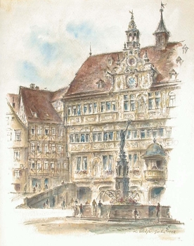 Ludwig Schäfer-Grohe (1909 Mainz-1983 Fellbach), deutscher Maler, Zeichner und Lithograph. Lithographen-Lehre, 1931 erste Sonderausstellung im Gutenberg-Museum Mainz. 1932 Studienfahrt nach Italien. 1934 Heirat mit der Malerin und Bildhauerin Susanne Grohe. 1936 Umzug nach Fellbach; Mitarbeit beim Stuttgarter Verlag und als freischaffender Künstler tätig. In eigener Planung: Städtebilder, künstleriche Bild-Landkarten, Malerfahrt - Bücher: u. a. Neckar/ Rhein/Tauber. Arbeiten in vielen Städten und Ländern. Nach Deutschland und Europa folgen Studienfahrten in ferne Gebiete: u.a. 1976 Marokko, 1977 Mesopotanien, 1978 Mexiko und Guatemala, 1979 Nepal-Indien-Sri Lanka, 1980 Ägypten. Besondere Aufträge wie z. B. 1979: Zeichnen in der Medici-Kapelle in Florenz für Fredy de Medicis, Brüssel. Ankäufe seiner Bilder u.a. von der Stadt Fellbach, dem Rems-Murr-Kreis, der Staatsgalerie Stuttgart. Literatur: Vollmer, Thieme Becker, Würtenbergisches Künstlerlexikon zahlreiche Zeitungsberichte/ Ausstellungsnachweise vorhanden.