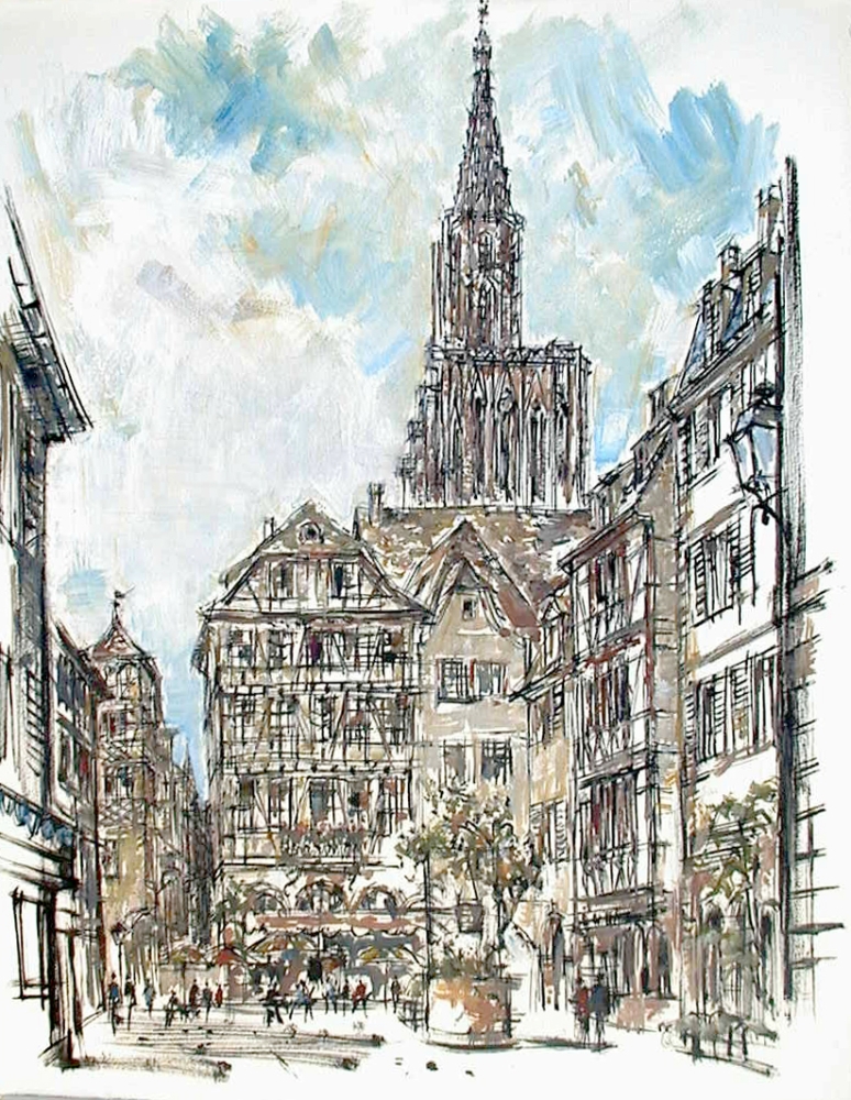 Ludwig Schäfer-Grohe (1909 Mainz-1983 Fellbach), deutscher Maler, Zeichner und Lithograph. Lithographen-Lehre, 1931 erste Sonderausstellung im Gutenberg-Museum Mainz. 1932 Studienfahrt nach Italien. 1934 Heirat mit der Malerin und Bildhauerin Susanne Grohe. 1936 Umzug nach Fellbach; Mitarbeit beim Stuttgarter Verlag und als freischaffender Künstler tätig. In eigener Planung: Städtebilder, künstleriche Bild-Landkarten, Malerfahrt - Bücher: u. a. Neckar/ Rhein/Tauber. Arbeiten in vielen Städten und Ländern. Nach Deutschland und Europa folgen Studienfahrten in ferne Gebiete: u.a. 1976 Marokko, 1977 Mesopotanien, 1978 Mexiko und Guatemala, 1979 Nepal-Indien-Sri Lanka, 1980 Ägypten. Besondere Aufträge wie z. B. 1979: Zeichnen in der Medici-Kapelle in Florenz für Fredy de Medicis, Brüssel. Ankäufe seiner Bilder u.a. von der Stadt Fellbach, dem Rems-Murr-Kreis, der Staatsgalerie Stuttgart. Literatur: Vollmer, Thieme Becker, Würtenbergisches Künstlerlexikon zahlreiche Zeitungsberichte/ Ausstellungsnachweise vorhanden.