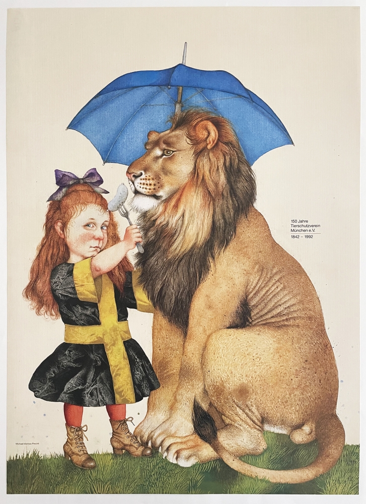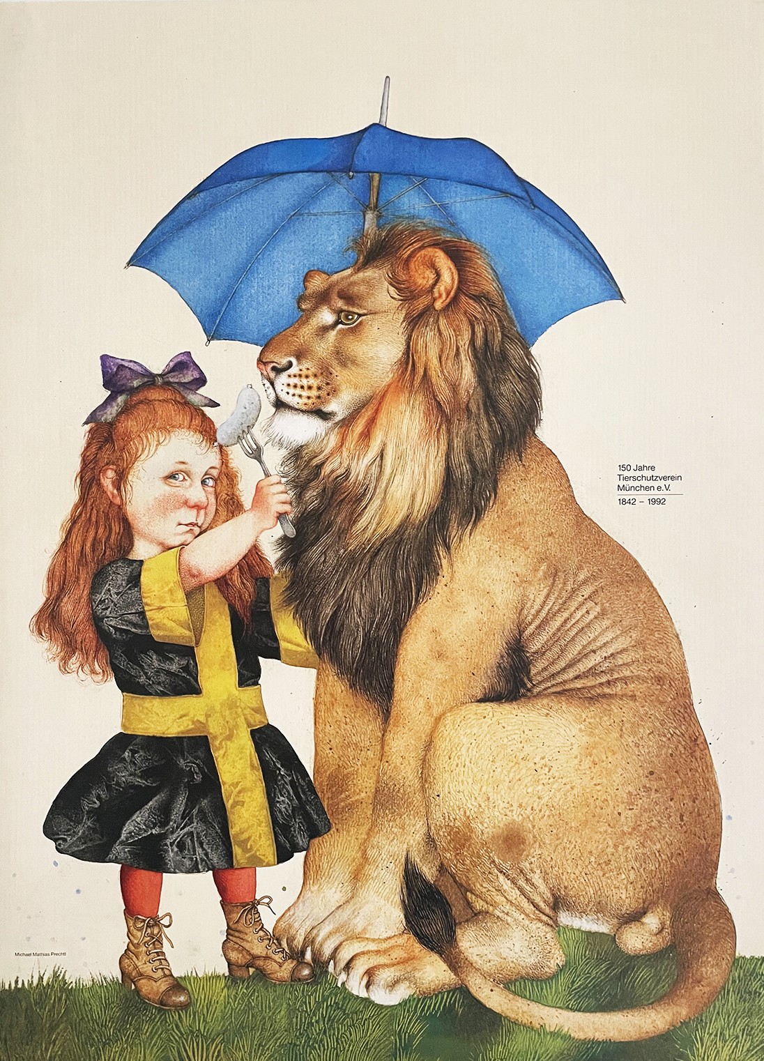 Michael Mathias Prechtl (1926 Amberg - 2003 Nürnberg) deutscher Maler, Illustrator und Karikaturist. 1950 Studium an der Nürnberger AdBK in Schloss Ellingen. 1952 erster Preis für die Ausstellung "Das internationale Plakat" in Karlsruhe. 1955 erstes Keramikwandbild. 1956 Heirat und Arbeit als freischaffender Künstler. Erster Preis für den Wettbewerb "Künstler sehen Nürnberg heute". 1965 Einzelausstellung in der Neuen Münchner Galerie. Prechtl beginnt mit der Bildserie "Intime Sitten- und Kulturgeschichte des Abendlandes". 1969-1986 Anfertigung der Dürer-Suite, bestehend aus großformatigen Rötelzeichnungen. 1970 entsteht der Keramikbrunnen-Gockelreiter für das Nürnberger Spielzeugmuseum. 1971 erster Portraitauftrag von der New York Times. 1972 Die Büchergilde Gutenberg beauftragt Prechtl zum ersten Mal ein Buch zu illustrieren: Oskar Maria Grafs "Das bayerische Dekameron". Jahrespreis des Art Director Clubs of New York für das Portrait des Friedensnobelpreisträgers und ehemaligen Bundeskanzlers Willy Brandt. Viele Ausstellungen, Theaterstücke, illustrierte Bücher folgen. Prechtl wurde vor allem bekannt durch seine Illustration literarischer Klassiker, etwa von E. T. A. Hoffmann, Thomas Morus, Dante, Goethe und Benvenuto Cellini oder auch der Briefe Wolfgang Amadeus Mozarts.