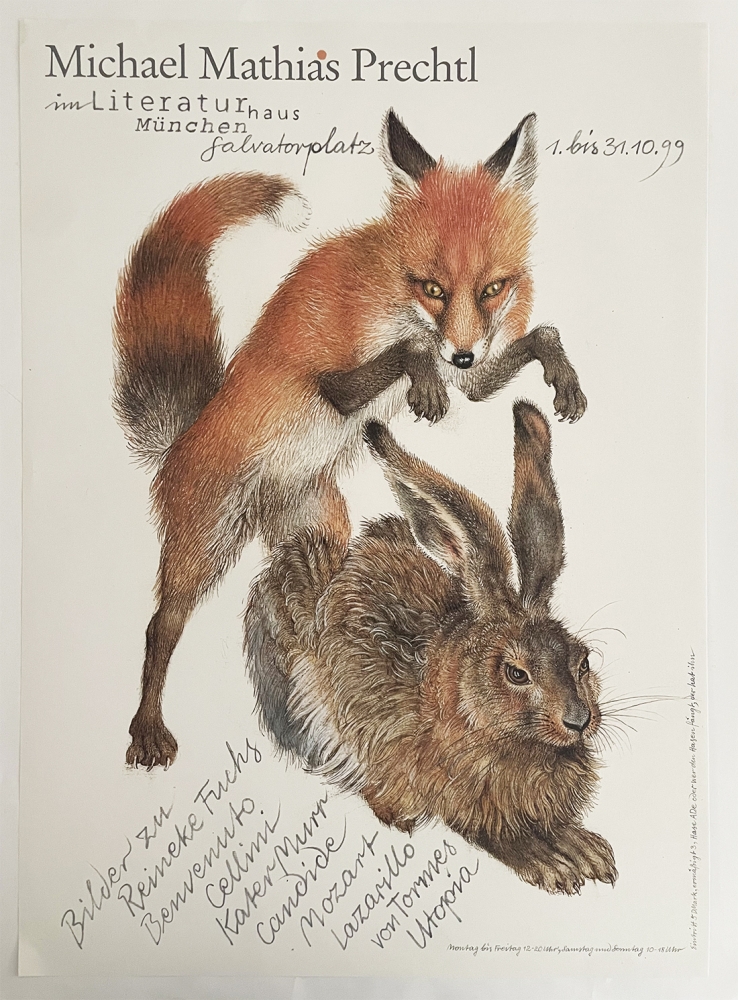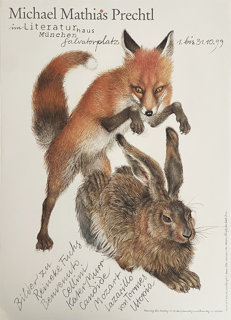 Michael Mathias Prechtl (1926 Amberg - 2003 Nürnberg) deutscher Maler, Illustrator und Karikaturist. 1950 Studium an der Nürnberger AdBK in Schloss Ellingen. 1952 erster Preis für die Ausstellung "Das internationale Plakat" in Karlsruhe. 1955 erstes Keramikwandbild. 1956 Heirat und Arbeit als freischaffender Künstler. Erster Preis für den Wettbewerb "Künstler sehen Nürnberg heute". 1965 Einzelausstellung in der Neuen Münchner Galerie. Prechtl beginnt mit der Bildserie "Intime Sitten- und Kulturgeschichte des Abendlandes". 1969-1986 Anfertigung der Dürer-Suite, bestehend aus großformatigen Rötelzeichnungen. 1970 entsteht der Keramikbrunnen-Gockelreiter für das Nürnberger Spielzeugmuseum. 1971 erster Portraitauftrag von der New York Times. 1972 Die Büchergilde Gutenberg beauftragt Prechtl zum ersten Mal ein Buch zu illustrieren: Oskar Maria Grafs "Das bayerische Dekameron". Jahrespreis des Art Director Clubs of New York für das Portrait des Friedensnobelpreisträgers und ehemaligen Bundeskanzlers Willy Brandt. Viele Ausstellungen, Theaterstücke, illustrierte Bücher folgen. Prechtl wurde vor allem bekannt durch seine Illustration literarischer Klassiker, etwa von E. T. A. Hoffmann, Thomas Morus, Dante, Goethe und Benvenuto Cellini oder auch der Briefe Wolfgang Amadeus Mozarts.
