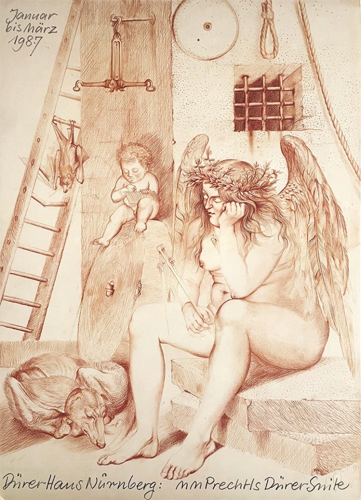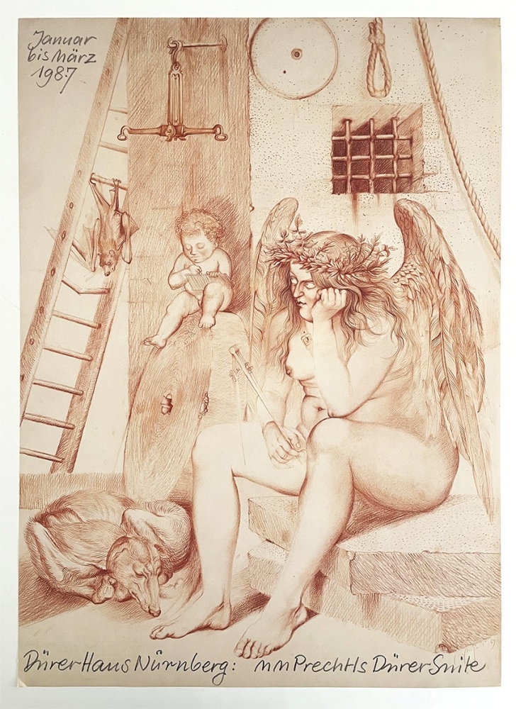 Michael Mathias Prechtl (1926 Amberg - 2003 Nürnberg) deutscher Maler, Illustrator und Karikaturist. 1950 Studium an der Nürnberger AdBK in Schloss Ellingen. 1952 erster Preis für die Ausstellung "Das internationale Plakat" in Karlsruhe. 1955 erstes Keramikwandbild. 1956 Heirat und Arbeit als freischaffender Künstler. Erster Preis für den Wettbewerb "Künstler sehen Nürnberg heute". 1965 Einzelausstellung in der Neuen Münchner Galerie. Prechtl beginnt mit der Bildserie "Intime Sitten- und Kulturgeschichte des Abendlandes". 1969-1986 Anfertigung der Dürer-Suite, bestehend aus großformatigen Rötelzeichnungen. 1970 entsteht der Keramikbrunnen-Gockelreiter für das Nürnberger Spielzeugmuseum. 1971 erster Portraitauftrag von der New York Times. 1972 Die Büchergilde Gutenberg beauftragt Prechtl zum ersten Mal ein Buch zu illustrieren: Oskar Maria Grafs "Das bayerische Dekameron". Jahrespreis des Art Director Clubs of New York für das Portrait des Friedensnobelpreisträgers und ehemaligen Bundeskanzlers Willy Brandt. Viele Ausstellungen, Theaterstücke, illustrierte Bücher folgen. Prechtl wurde vor allem bekannt durch seine Illustration literarischer Klassiker, etwa von E. T. A. Hoffmann, Thomas Morus, Dante, Goethe und Benvenuto Cellini oder auch der Briefe Wolfgang Amadeus Mozarts.