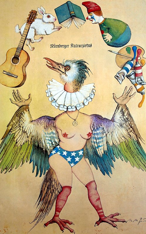 Michael Mathias Prechtl (1926 Amberg - 2003 Nürnberg) deutscher Maler, Illustrator und Karikaturist. 1950 Studium an der Nürnberger AdBK in Schloss Ellingen. 1952 erster Preis für die Ausstellung "Das internationale Plakat" in Karlsruhe. 1955 erstes Keramikwandbild. 1956 Heirat und Arbeit als freischaffender Künstler. Erster Preis für den Wettbewerb "Künstler sehen Nürnberg heute". 1965 Einzelausstellung in der Neuen Münchner Galerie. Prechtl beginnt mit der Bildserie "Intime Sitten- und Kulturgeschichte des Abendlandes". 1969-1986 Anfertigung der Dürer-Suite, bestehend aus großformatigen Rötelzeichnungen. 1970 entsteht der Keramikbrunnen-Gockelreiter für das Nürnberger Spielzeugmuseum. 1971 erster Portraitauftrag von der New York Times. 1972 Die Büchergilde Gutenberg beauftragt Prechtl zum ersten Mal ein Buch zu illustrieren: Oskar Maria Grafs "Das bayerische Dekameron". Jahrespreis des Art Director Clubs of New York für das Portrait des Friedensnobelpreisträgers und ehemaligen Bundeskanzlers Willy Brandt. Viele Ausstellungen, Theaterstücke, illustrierte Bücher folgen. Prechtl wurde vor allem bekannt durch seine Illustration literarischer Klassiker, etwa von E. T. A. Hoffmann, Thomas Morus, Dante, Goethe und Benvenuto Cellini oder auch der Briefe Wolfgang Amadeus Mozarts. Einer größeren Öffentlichkeit wurde er auch durch mehrere Titelillustrationen für den Spiegel bekannt, die er in den 80er Jahren gestaltete.