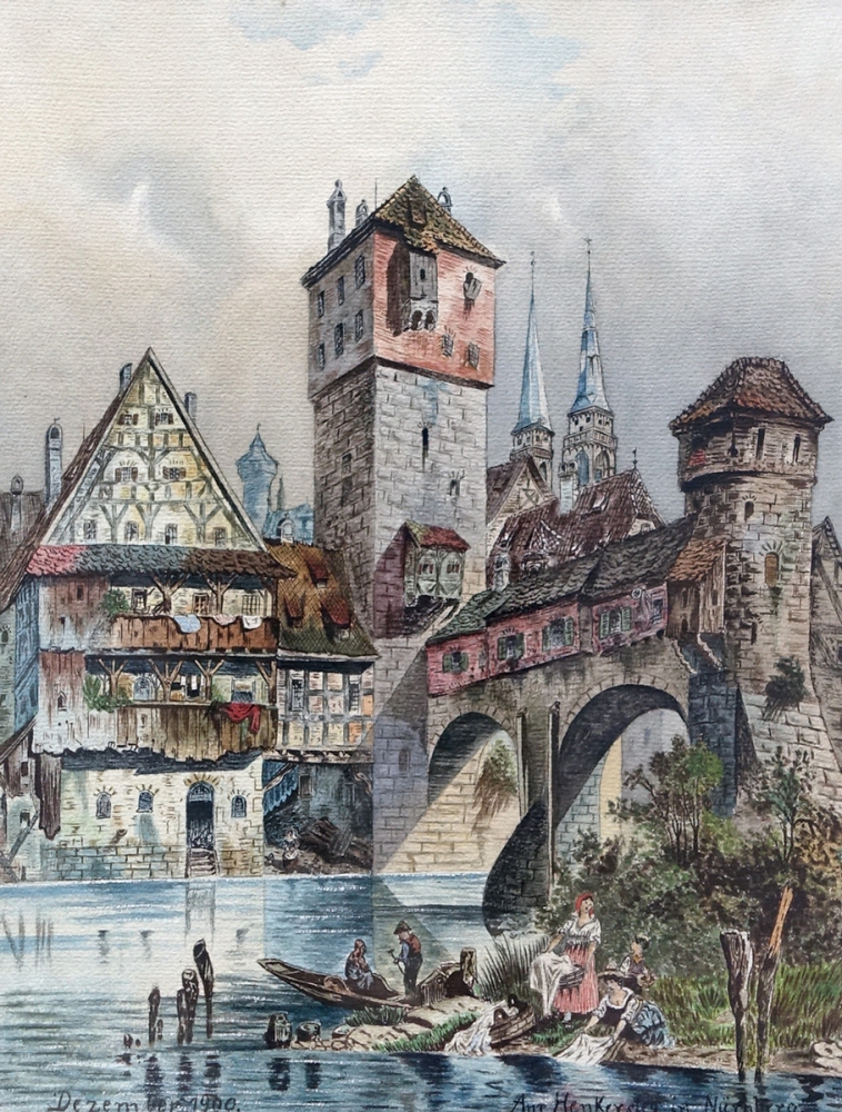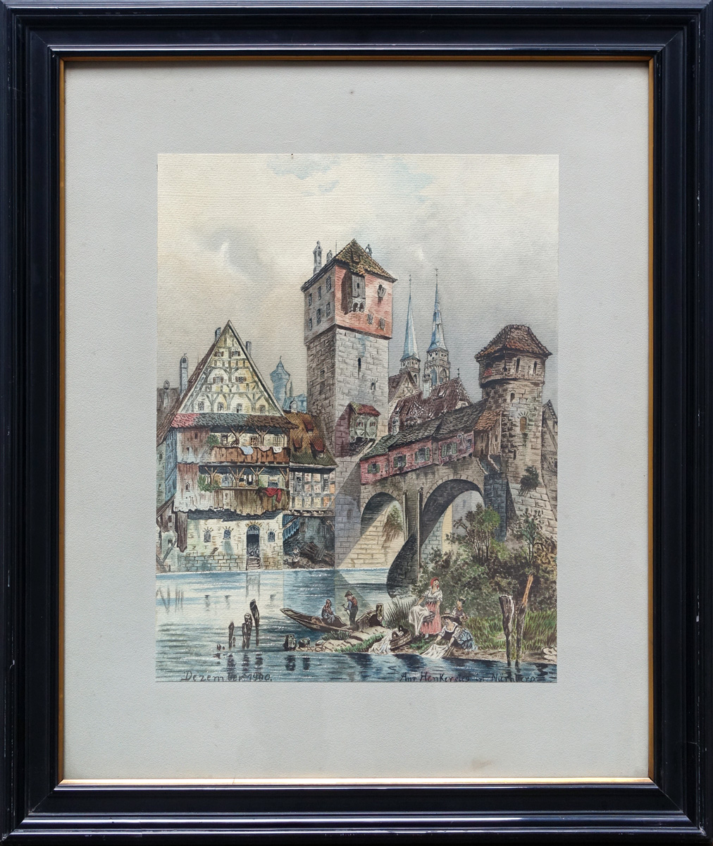 Rudolf Holubowsky (geb. 1863) Am Henkersteg in Nürnberg Aquarell m. Tusche/Feder, dat. Dezember 1900, Maße mit Rahmen 65 x 54,5 cm, Motiv 40,5 x 30,5 cm
