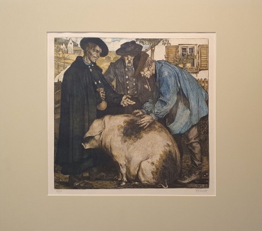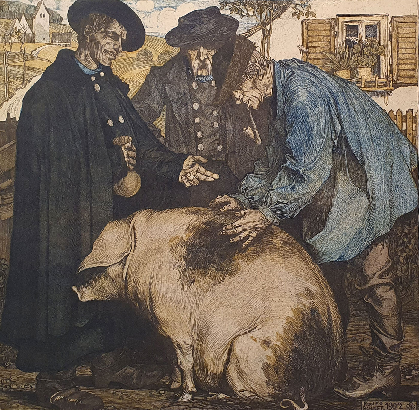 Rudolf Schiestl, Prof. (08.08.1878 in Würzburg - 30.11.1931 in Nürnberg): Graphiker und Maler. Begann mit 12 Jahren eine Lehre im Bildhaueratelier seines Vaters. 1896 Besuch der Akademie in München. Im Herbst 1898 ließ er sich in Kornhöfstadt im Steigerwald nieder. Im Sommer 1899 arbeitete er in der Tiroler Glasmalerwerkstatt in Innsbruck, 1900 schuf er Wandmalereien in der Pfalz. 1901 machte er sich selbstständig. In den Sommermonaten 1903, 1904 und 1907 besuchte er Italien, außerdem bereiste er Frankreich, Österreich, Holland und Norddeutschland. 1909/10 wurde er Nachfolger von Bek-Gran an der Nürnberger Kunstgewerbeschule, ab 1928 umbenannt in Staatsschule für angewandte Kunst, dort bis zu seinem Tod tätig, zuletzt als o. Professor für freie Graphik und Buchschmuck.