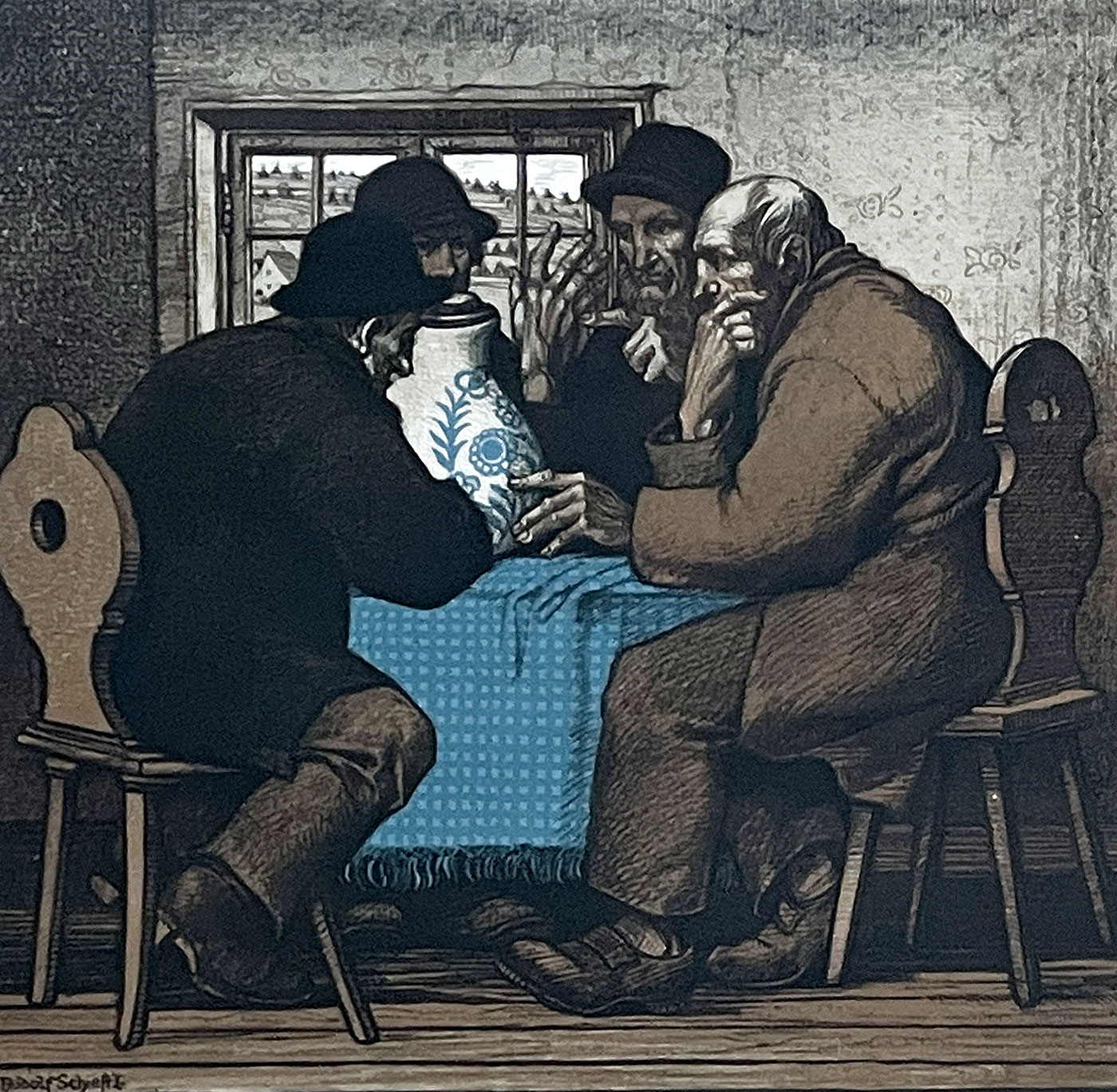 Rudolf Schiestl, Prof. (08.08.1878 in Würzburg - 30.11.1931 in Nürnberg): Graphiker und Maler. Begann mit 12 Jahren eine Lehre im Bildhaueratelier seines Vaters. 1896 Besuch der Akademie in München. Im Herbst 1898 ließ er sich in Kornhöfstadt im Steigerwald nieder. Im Sommer 1899 arbeitete er in der Tiroler Glasmalerwerkstatt in Innsbruck, 1900 schuf er Wandmalereien in der Pfalz. 1901 machte er sich selbstständig. In den Sommermonaten 1903, 1904 und 1907 besuchte er Italien, außerdem bereiste er Frankreich, Österreich, Holland und Norddeutschland. 1909/10 wurde er Nachfolger von Bek-Gran an der Nürnberger Kunstgewerbeschule, ab 1928 umbenannt in Staatsschule für angewandte Kunst, dort bis zu seinem Tod tätig, zuletzt als o. Professor für freie Graphik und Buchschmuck.