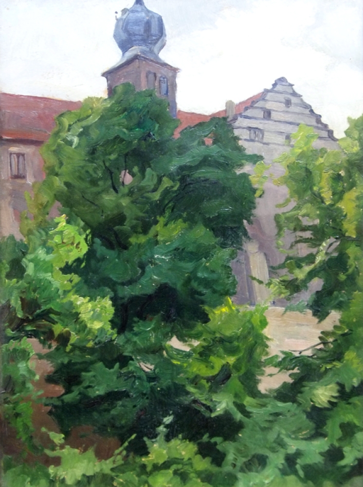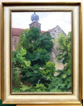 Thomas Bachmeier, Landschaftsmaler, Graphiker, 31.05.1895 Nürnberg bis 29.08.1960 Nürnberg. Lithographenlehre in der Kunstanstalt Nister, wo ihn Ludwig Kühn förderte und wo ihm aufgrund seiner hervorragenden Leistungen ein Teil seiner Lehrzeit erlassen wurde. 1911-18 Besuch der Kunstgewerbeschule Nürnberg unter Rudolf Schiestl, 1914-18 durch Kriegsdienst unterbrochen, anschließend Studium an der Akademie München. Studienreisen durch Deutschland. Graphiker bei Zerreiss & Co. und 1922-23 freischaffender Maler und Graphiker in Nürnberg. 1939/42 Kriegsmaler an der Westfront. Er war vor allem Landschaftsmaler, wobei er über Jahrzehnte Rhönlandschaften bevorzugte. Nach 1945 malt er auch Ruinenbilder von Nürnberg. Mitglied der Nürnberger Kunstgenossenschaft, des Künstlervereins, der Künstlerklause, der Nürnberger Künstlergenossenschaft, sowie der Künstlergruppen "Die Hütte" und "Freie Gruppe".