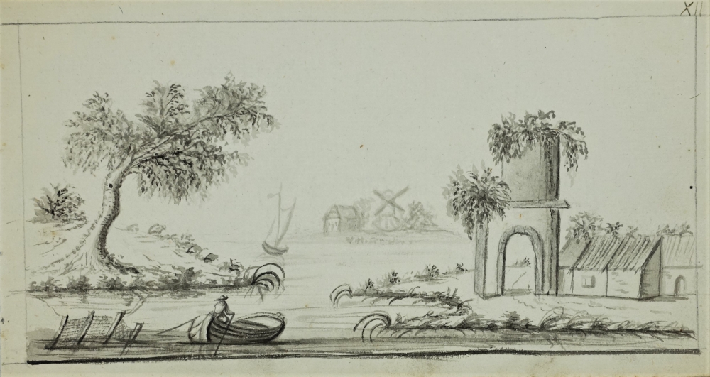 (17. Jhd.) Flußlandschaft mit Ruderer vor einer Ruine Kohlezeichunung, Maße 19 x 19,5 cm, Teil eines mehrseitigen Reiseskizzenbuchs