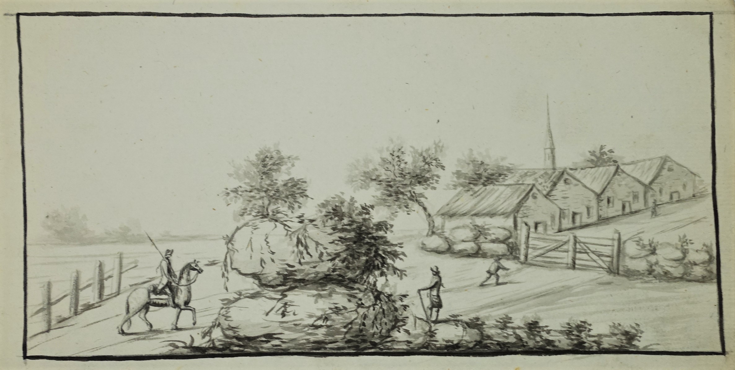 (17. Jhd.) Reiter vor dem Dorf Kohlezeichunung, Maße 19 x 19,5 cm, Teil eines mehrseitigen Reiseskizzenbuchs