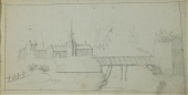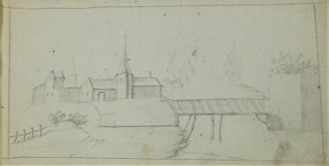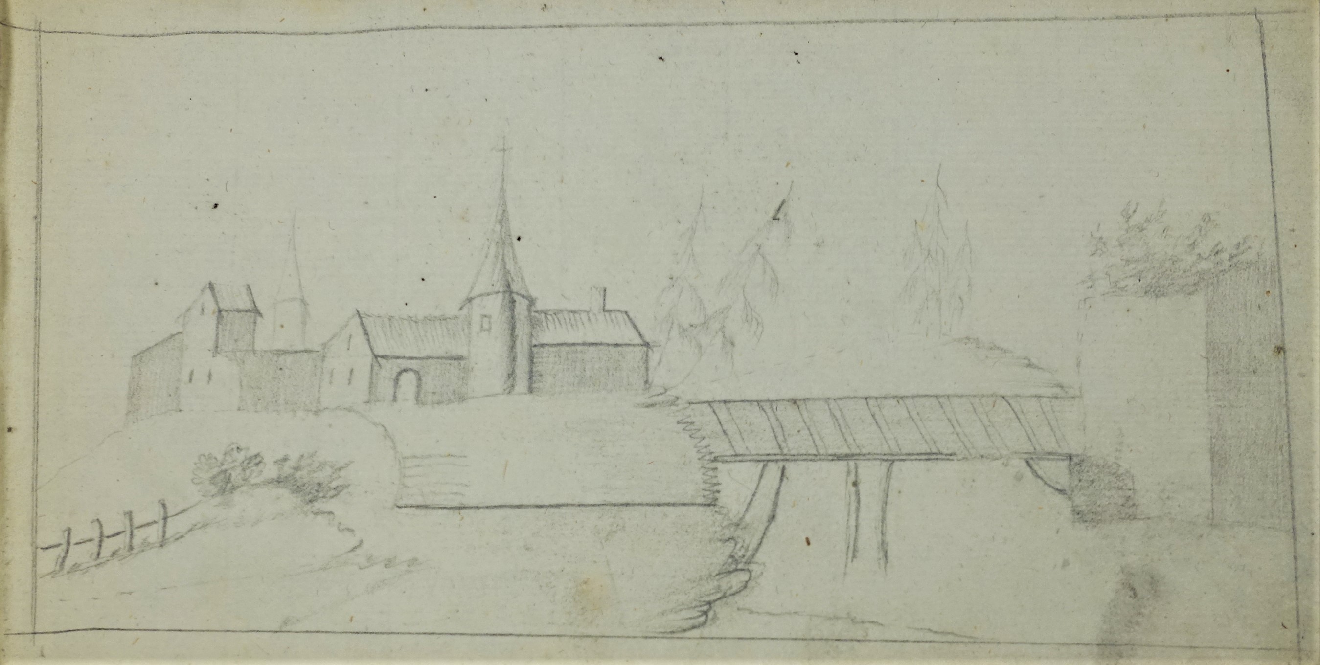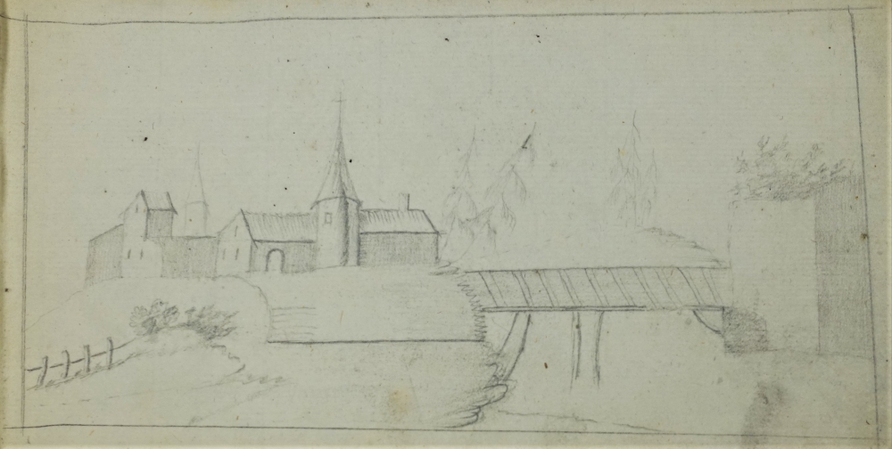 (17. Jhd.) Skizze von Stadtmauer Kohlezeichunung, Maße 19 x 19,5 cm, Teil eines mehrseitigen Reiseskizzenbuchs