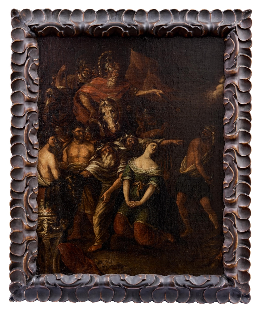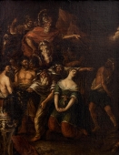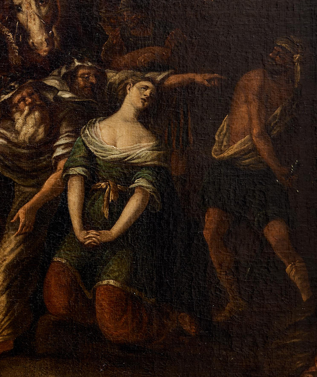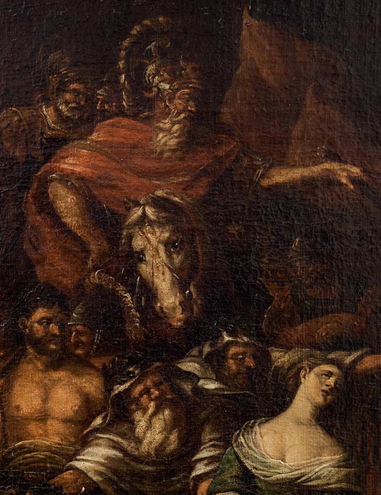 Mehrfigurige Szene mit Reitern, Soldaten und einem Opferstier.