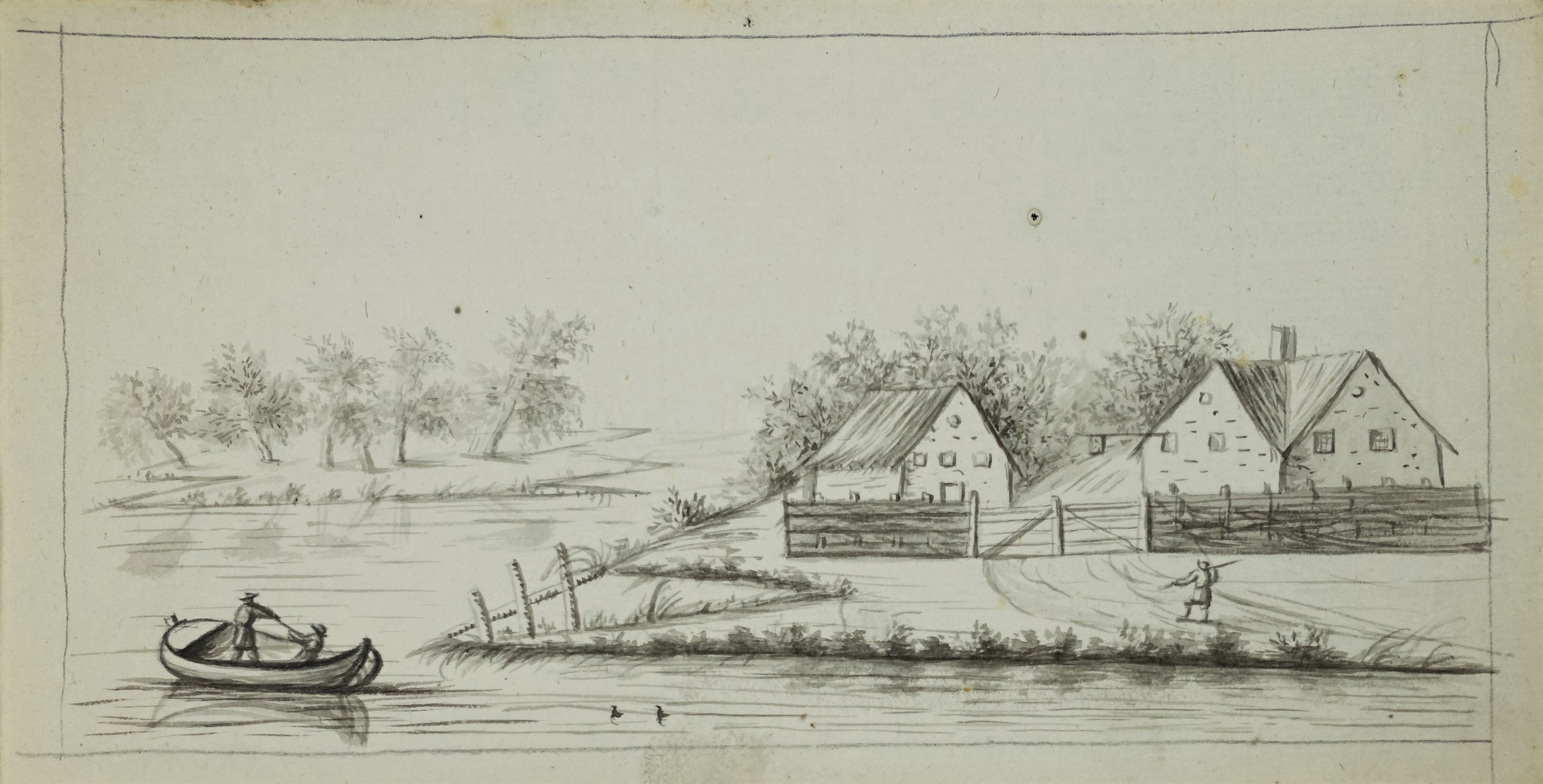 (17. Jhd.) Flußlandschaft mit Ruderer Kohlezeichunung, Maße 19 x 19,5 cm, Teil eines mehrseitigen Reiseskizzenbuchs