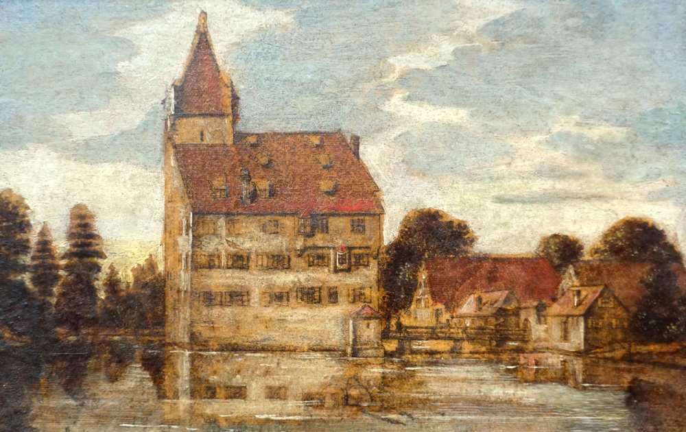 Schloß Unterbürg Nürnberg von der Seite Öl auf Holz, Maße 11 x 17 cm, Maße mit Rahmen 15,5 x 21,5 cm, unsigniert