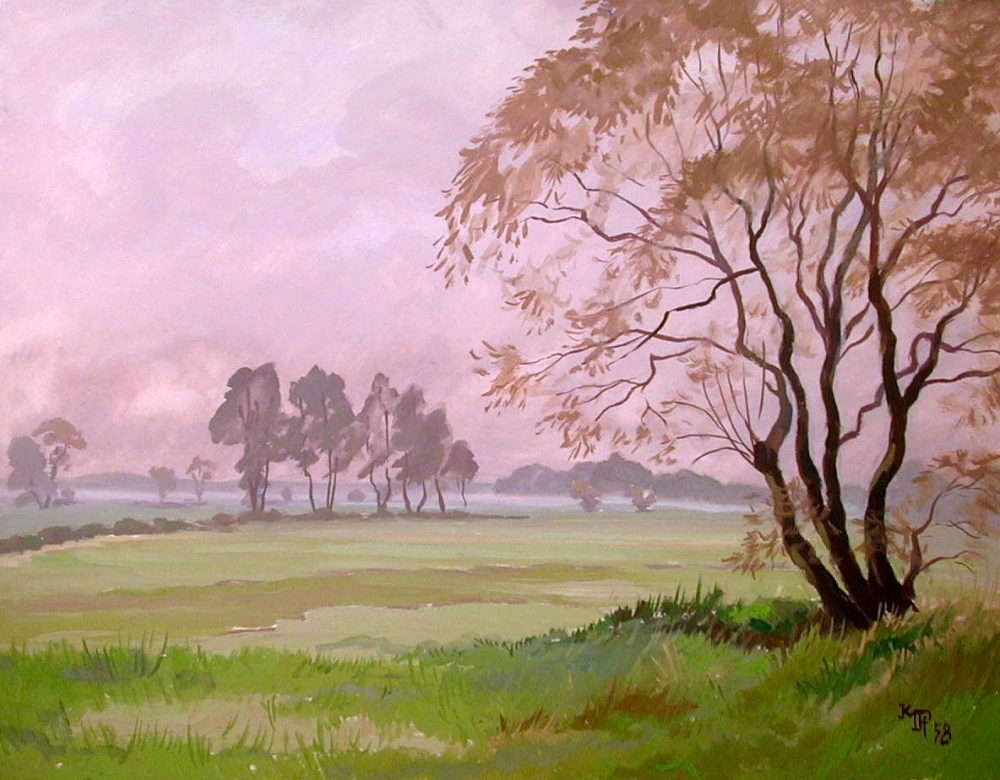 Kurt Mayer-Pfalz (30.4. 1911 Nürnberg - nach 2002) Bühnenbildner und Landschaftsmaler. Studium an der Akademie für angewandte Kunst in München bei Prof. Pretorius. Mayer-Pfalz arbeitete an der Stuttgarter Volksbühne, später im Nürnberger Schauspielhaus, wo er den Bühnenbildner Heinz Grete kennen lernte, der ihn in die Kunst der Bühnengestaltung einführte. Später übernahm K. Mayer-Pfalz dessen Aufgaben als Nachfolger und war auch 15 Jahre für die Gestaltung der Bühnen im Opernhaus Nürnberg verantwortlich. Zwischenzeitlich war er in Bad Segeberg mit der Kulissengestaltung der Karl-May Festspiele beauftragt, hierfür hatte er vorab ein riesiges Modell angefertigt. Auch bei den Hessfelder Festspielen 1950 waren seine Bühnenentwürfe gefragt. Sein weiterer Berufsweg führte Ihn nach Erlangen, wo er für die Firma Siemens im graphischen Bereich tätig war. K. Mayer-Pfalz war meist mit dem Fahrrad unterwegs, als Freilichtmaler tätig entstanden seine Landschaftsgemälde ausschließlich vor Ort. Seine Malerfahrten führten ihn meist in die Fränkische Schweiz. Die Blattgröße seiner Tempera-Gemälde (40 x 31cm) ergab sich aus der Tatsache, dass diese Blätter genau in den Malkasten passten, der sich fast immer auf dem Fahrradträger befand. Eine geplante Ausstellung in der Nürnberger Kunsthalle am Marientor kam nicht zustande, da der Künstler kurz vorher zur Wehrmacht eingezogen wurde. K. Mayer-Pfalz lebte 2002 noch in Erlangen.