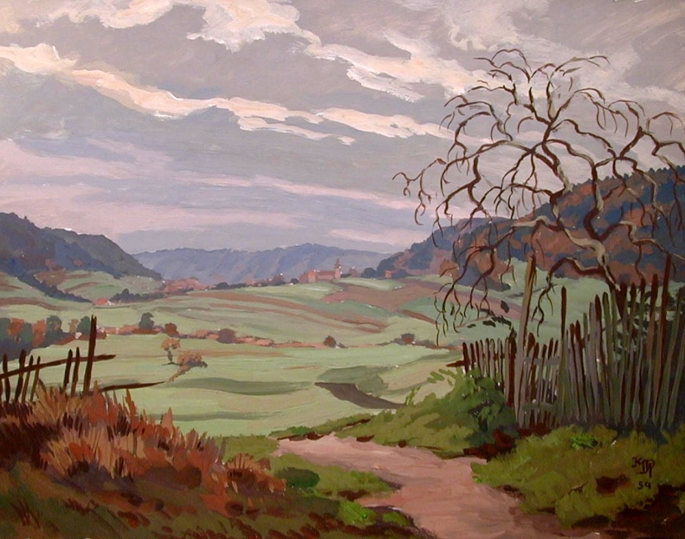 Kurt Mayer-Pfalz (30.4. 1911 Nürnberg - nach 2002) Bühnenbildner und Landschaftsmaler. Studium an der Akademie für angewandte Kunst in München bei Prof. Pretorius. Mayer-Pfalz arbeitete an der Stuttgarter Volksbühne, später im Nürnberger Schauspielhaus, wo er den Bühnenbildner Heinz Grete kennen lernte, der ihn in die Kunst der Bühnengestaltung einführte. Später übernahm K. Mayer-Pfalz dessen Aufgaben als Nachfolger und war auch 15 Jahre für die Gestaltung der Bühnen im Opernhaus Nürnberg verantwortlich. Zwischenzeitlich war er in Bad Segeberg mit der Kulissengestaltung der Karl-May Festspiele beauftragt, hierfür hatte er vorab ein riesiges Modell angefertigt. Auch bei den Hessfelder Festspielen 1950 waren seine Bühnenentwürfe gefragt. Sein weiterer Berufsweg führte Ihn nach Erlangen, wo er für die Firma Siemens im graphischen Bereich tätig war. K. Mayer-Pfalz war meist mit dem Fahrrad unterwegs, als Freilichtmaler tätig entstanden seine Landschaftsgemälde ausschließlich vor Ort. Seine Malerfahrten führten ihn meist in die Fränkische Schweiz. Die Blattgröße seiner Tempera-Gemälde (40 x 31cm) ergab sich aus der Tatsache, dass diese Blätter genau in den Malkasten passten, der sich fast immer auf dem Fahrradträger befand. Eine geplante Ausstellung in der Nürnberger Kunsthalle am Marientor kam nicht zustande, da der Künstler kurz vorher zur Wehrmacht eingezogen wurde. K. Mayer-Pfalz lebte 2002 noch in Erlangen.