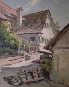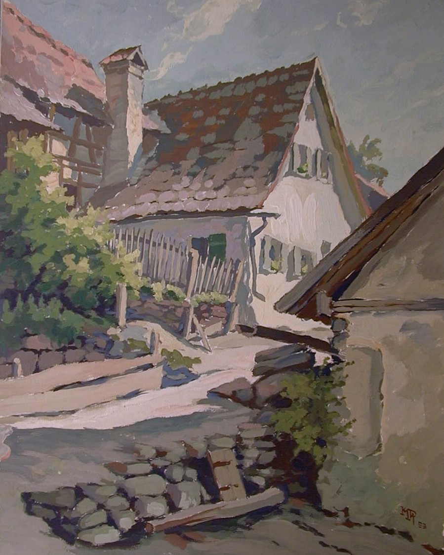 Kurt Mayer-Pfalz (30.4. 1911 Nürnberg - nach 2002) Bühnenbildner und Landschaftsmaler. Studium an der Akademie für angewandte Kunst in München bei Prof. Pretorius. Mayer-Pfalz arbeitete an der Stuttgarter Volksbühne, später im Nürnberger Schauspielhaus, wo er den Bühnenbildner Heinz Grete kennen lernte, der ihn in die Kunst der Bühnengestaltung einführte. Später übernahm K. Mayer-Pfalz dessen Aufgaben als Nachfolger und war auch 15 Jahre für die Gestaltung der Bühnen im Opernhaus Nürnberg verantwortlich. Zwischenzeitlich war er in Bad Segeberg mit der Kulissengestaltung der Karl-May Festspiele beauftragt, hierfür hatte er vorab ein riesiges Modell angefertigt. Auch bei den Hessfelder Festspielen 1950 waren seine Bühnenentwürfe gefragt. Sein weiterer Berufsweg führte Ihn nach Erlangen, wo er für die Firma Siemens im graphischen Bereich tätig war. K. Mayer-Pfalz war meist mit dem Fahrrad unterwegs, als Freilichtmaler tätig entstanden seine Landschaftsgemälde ausschließlich vor Ort. Seine Malerfahrten führten ihn meist in die Fränkische Schweiz. Die Blattgröße seiner Tempera-Gemälde (40 x 31cm) ergab sich aus der Tatsache, dass diese Blätter genau in den Malkasten passten, der sich fast immer auf dem Fahrradträger befand. Eine geplante Ausstellung in der Nürnberger Kunsthalle am Marientor kam nicht zustande, da der Künstler kurz vorher zur Wehrmacht eingezogen wurde. K. Mayer-Pfalz lebte 2002 noch in Erlangen.